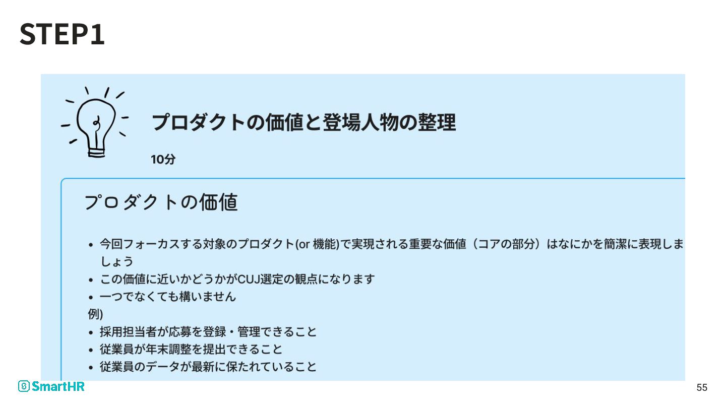 53 ワークショップの構成 • (別紙)ワークショップの実施⽅法 • プロダクトの価値と登場⼈物の整理 • CUJ候補洗い出し • CUJで通るタスクの洗い出し