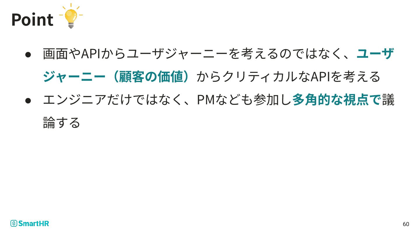 Point • 画⾯やAPIからユーザジャーニーを考えるのではなく、ユーザ ジャーニー(顧客の価値)からクリティカルなAPIを考える • エンジニアだけではなく、PMなども参加し多⾓的な視点で議 論する 60