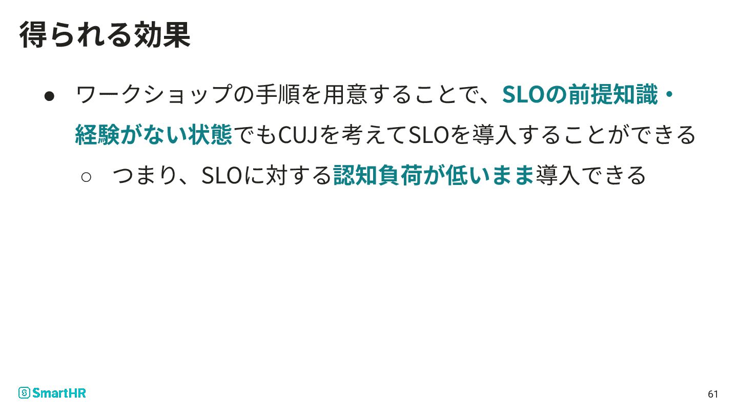 • ワークショップの⼿順を⽤意することで、SLOの前提知識‧ 経験がない状態でもCUJを考えてSLOを導⼊することができる ◦ つまり、SLOに対する認知負荷が低いまま導⼊できる 61 得られる効果