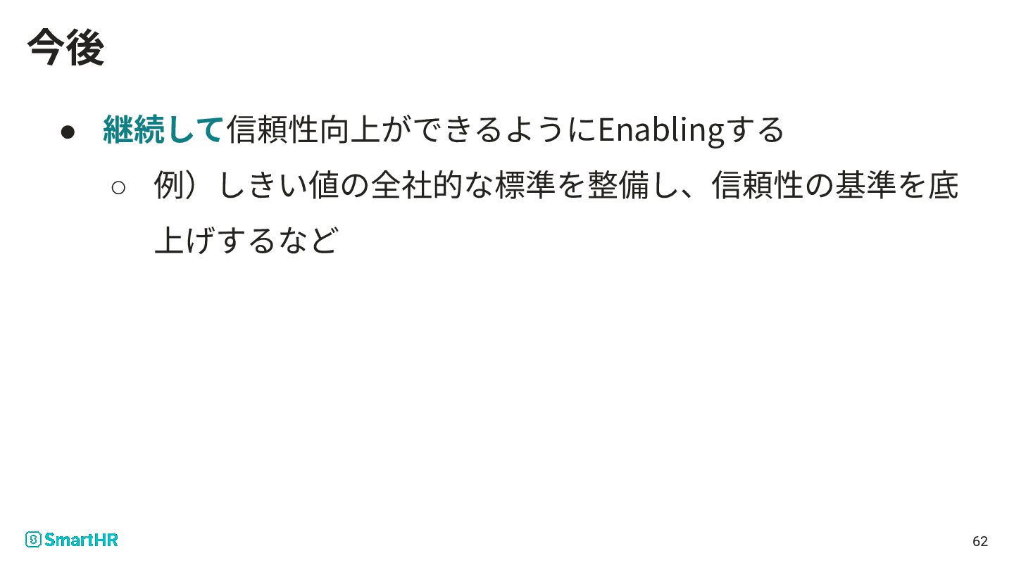 • 継続して信頼性向上ができるようにEnablingする ◦ 例)しきい値の全社的な標準を整備し、信頼性の基準を底 上げするなど 62 今後