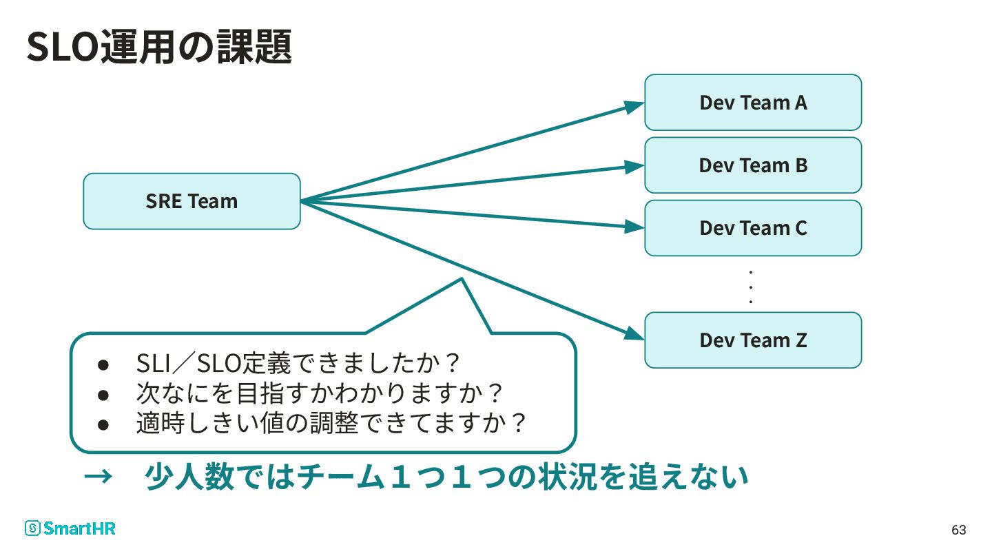 ‧ ‧ ‧ Dev Team Z SRE Team • SLI∕SLO定義できましたか? • 次なにを⽬指すかわかりますか? • 適時しきい値の調整できてますか? 63 SLO運⽤の課題