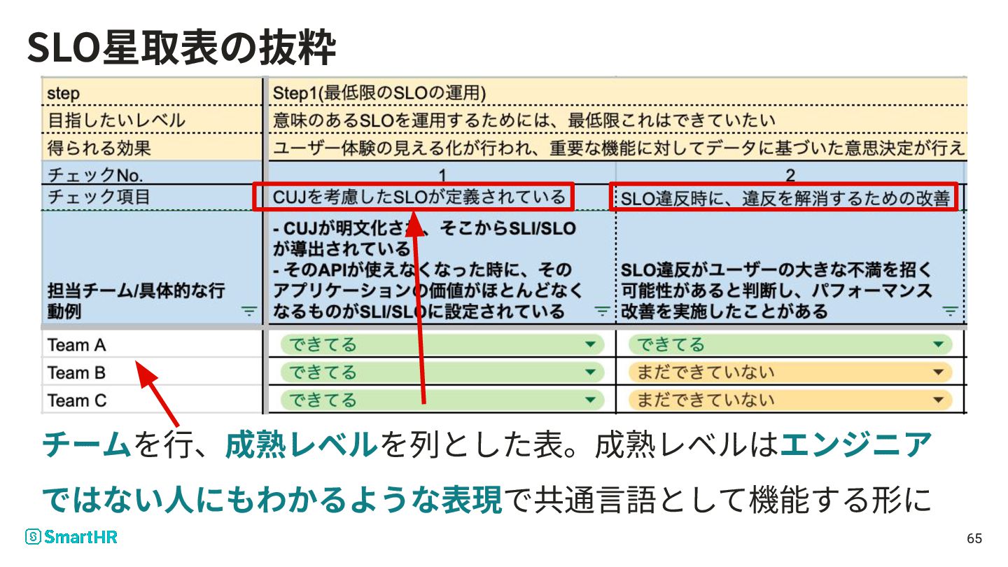 SLO星取表の抜粋 65 チームを⾏、成熟レベルを列とした表。成熟レベルはエンジニア ではない⼈にもわかるような表現で共通⾔語として機能する形に