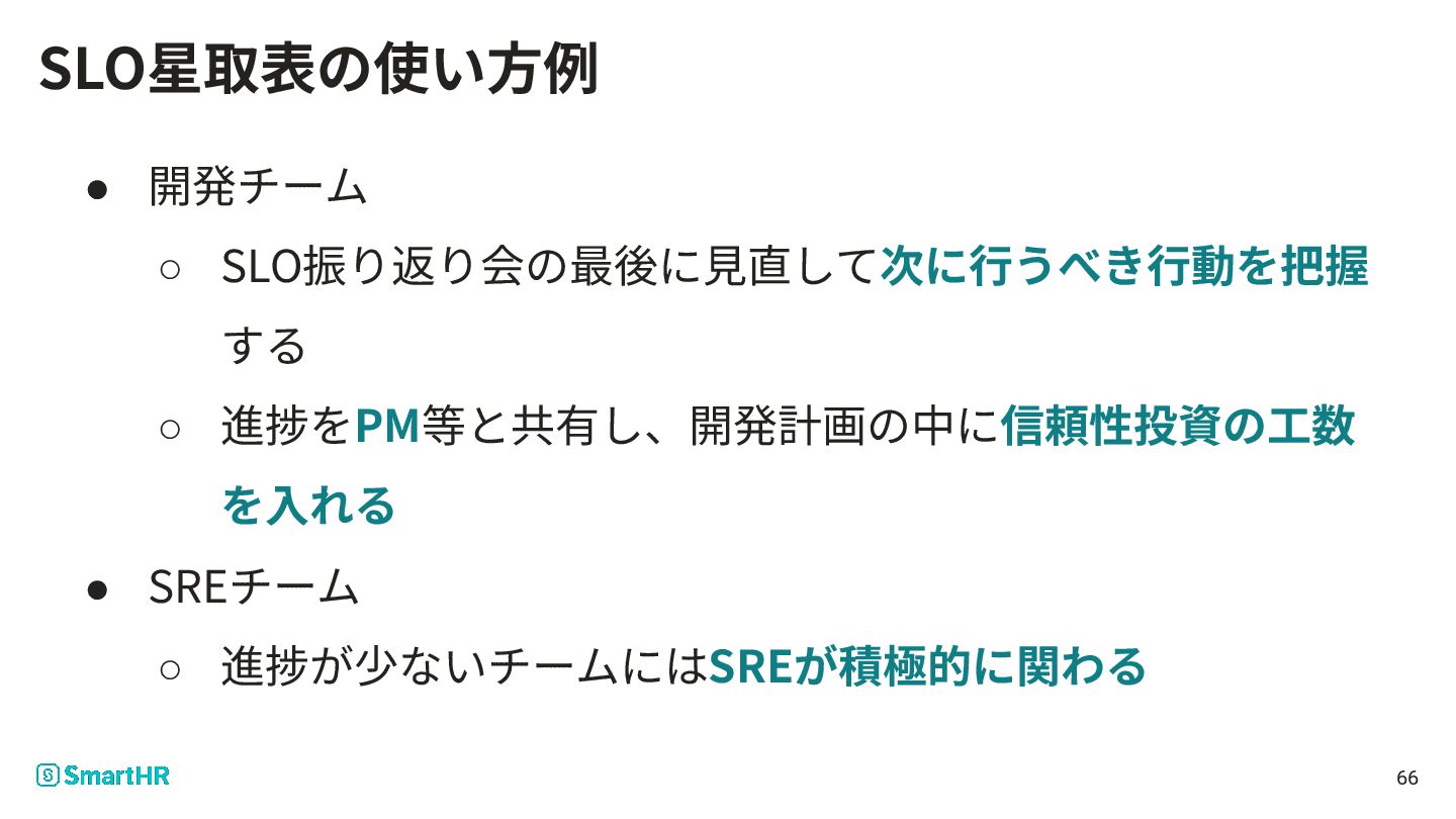 • 開発チーム ◦ SLO振り返り会の最後に⾒直して次に⾏うべき⾏動を把握 する ◦ 進捗をPM等と共有し、開発計画の中に信頼性投資の⼯数 を⼊れる • SREチーム