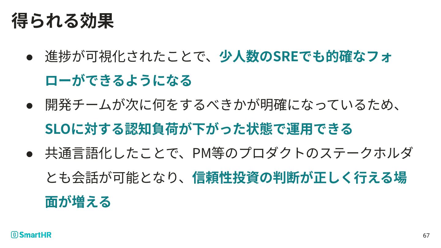 • 進捗が可視化されたことで、少⼈数のSREでも的確なフォ ローができるようになる • 開発チームが次に何をするべきかが明確になっているため、 SLOに対する認知負荷が下がった状態で運⽤できる • 共通⾔語化したことで、PM等のプロダクトのステークホルダ とも会話が可能となり、信頼性投資の判断が正しく⾏える場 ⾯が増える