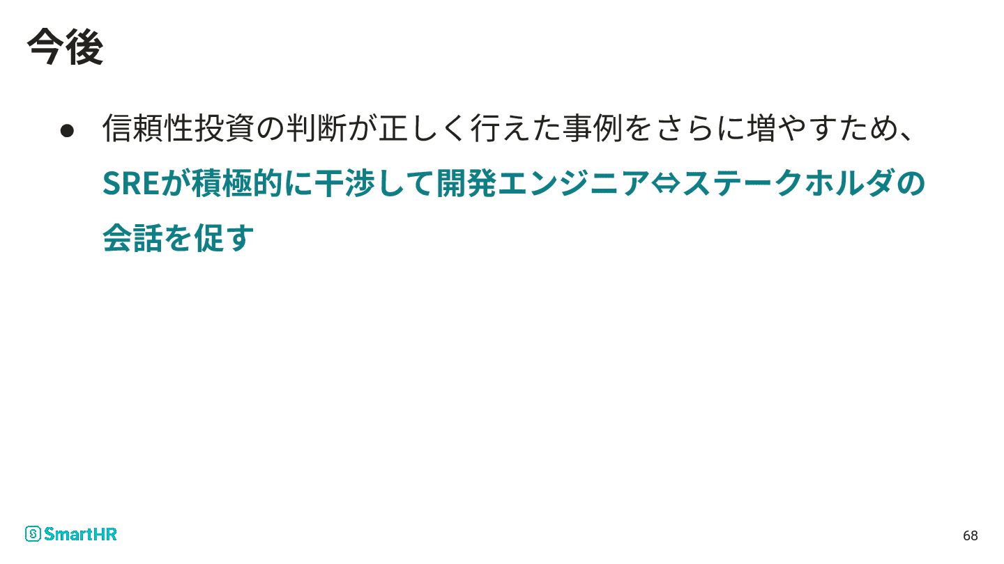 • 信頼性投資の判断が正しく⾏えた事例をさらに増やすため、 SREが積極的に⼲渉して開発エンジニア⇔ステークホルダの 会話を促す 68 今後