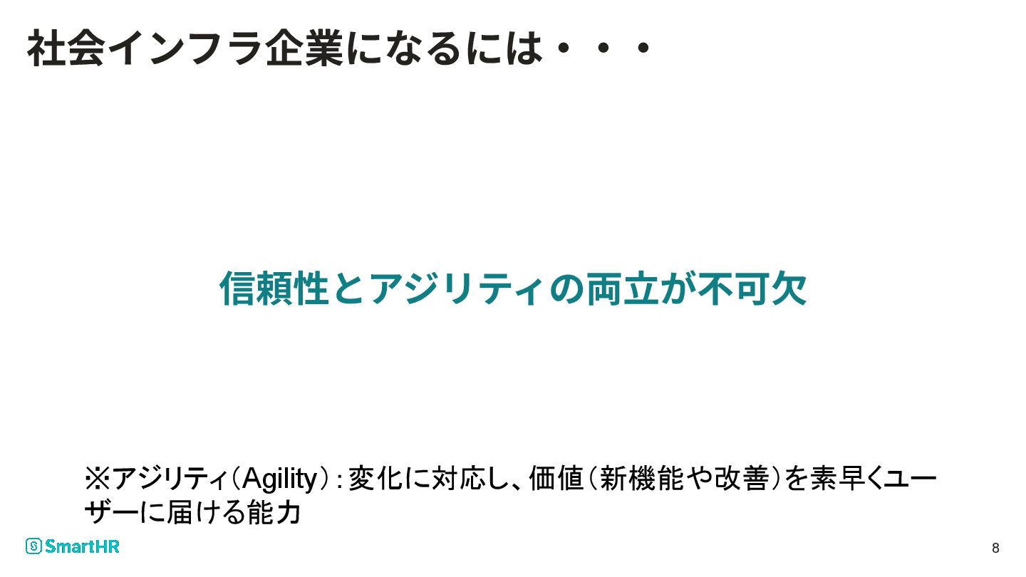 信頼性とアジリティの両⽴が不可⽋ ※アジリティ(Agility):変化に対応し、価値(新機能や改善)を素早くユー ザーに届ける能力 8 社会インフラ企業になるには‧‧‧