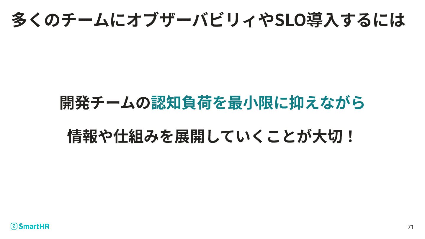 開発チームの認知負荷を最⼩限に抑えながら 情報や仕組みを展開していくことが⼤切! 71 多くのチームにオブザーバビリィやSLO導⼊するには