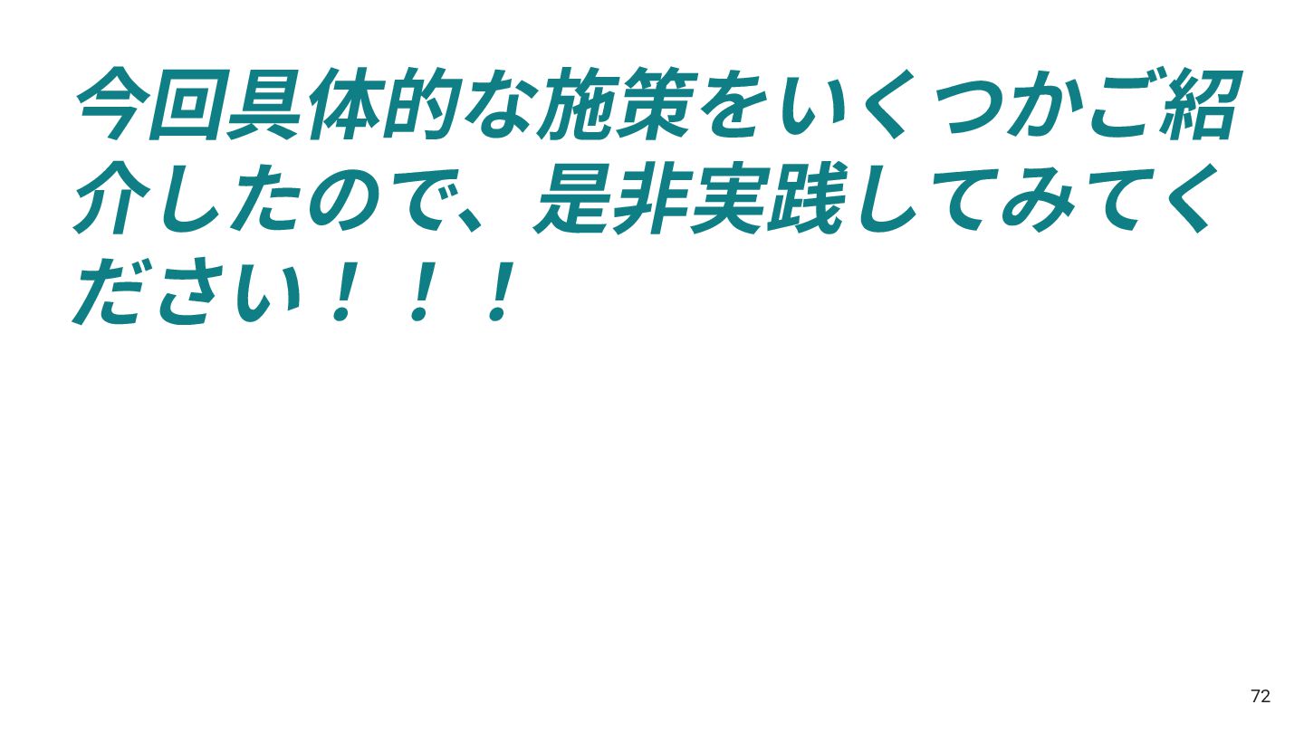 今回具体的な施策をいくつかご紹 介したので、是⾮実践してみてく ださい!!! 72