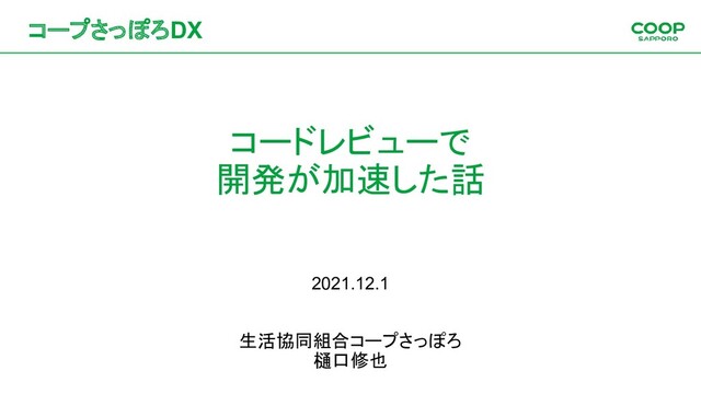 コードレビューで 開発が加速した話 2021.12.1 生活協同組合コープさっぽろ 樋口修也 コープさっぽろDX