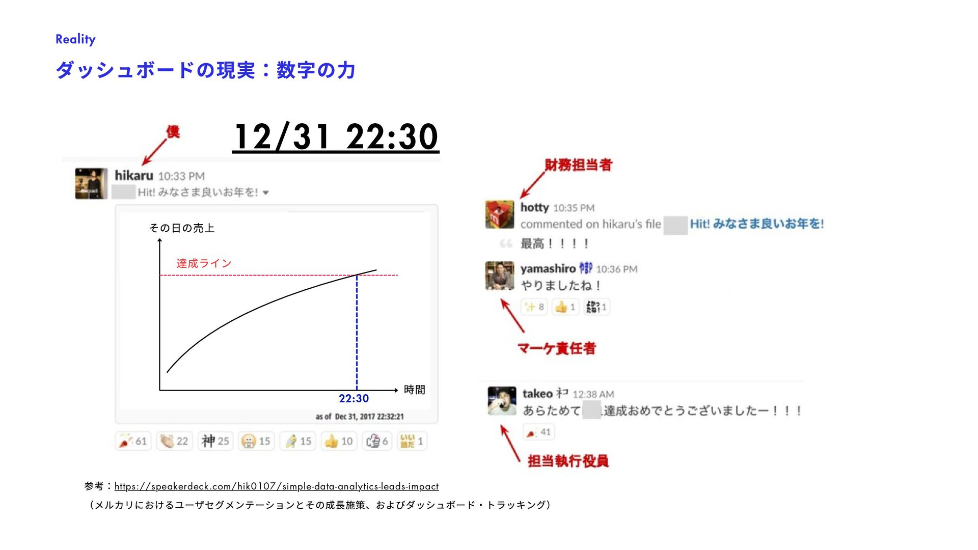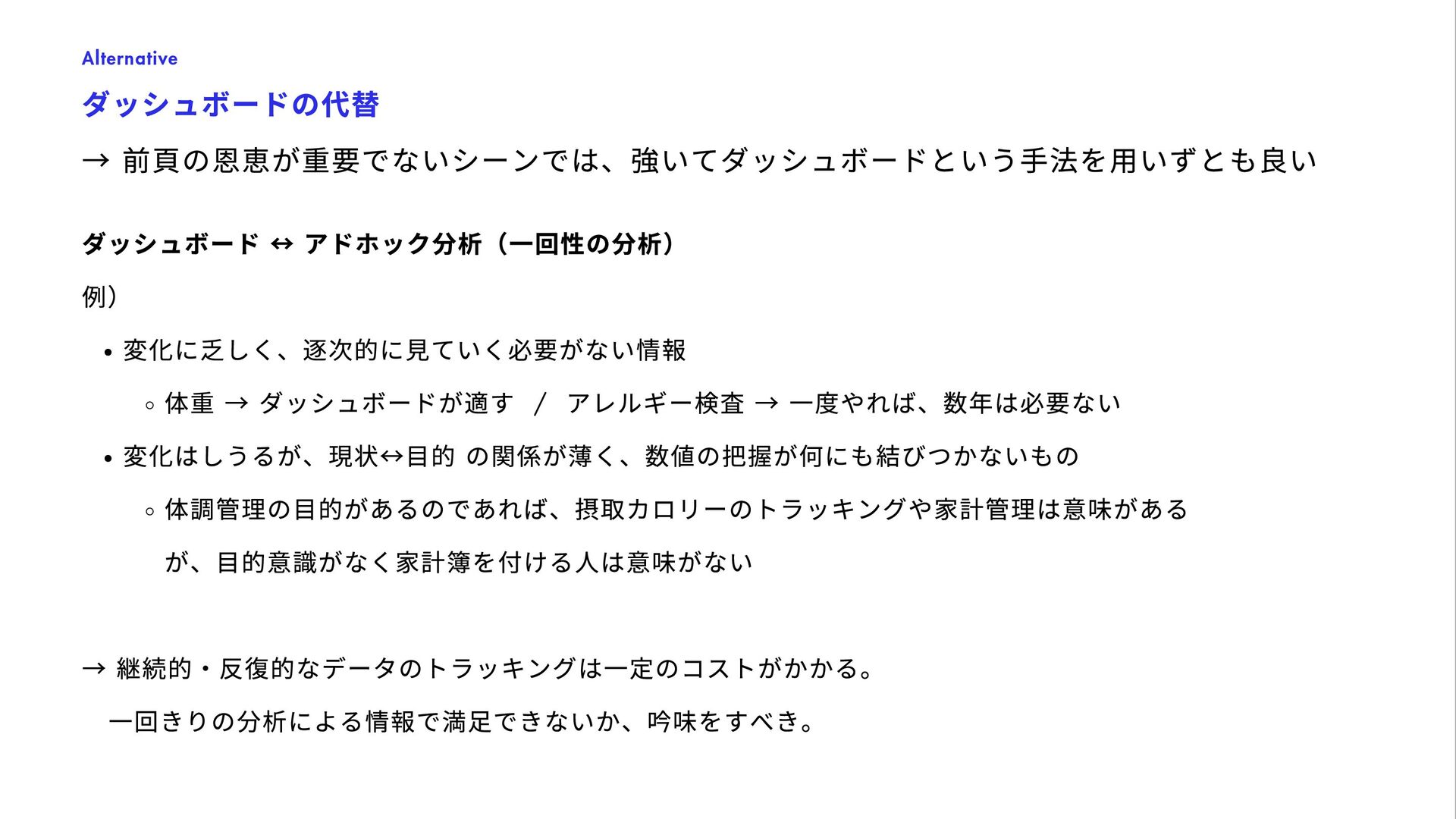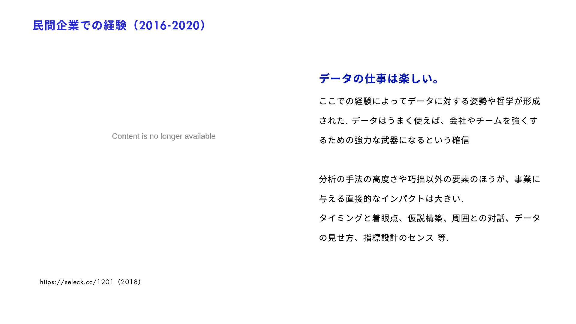 列 or 3 列でどちらが優れているか? ・どのような検索アルゴリズムが購買に好影響か? 機能のA/B テスト(RCT ) User Interface, 新機能, 検索アルゴリズム, etc. CRM Planning / Evaluation 新規顧客の獲得、 および顧客価値の最⼤化 ・5%/8% offのどちらのほうがビジネスに優位か? ・1000ptプレゼントはLTVベースでPay-Backしうるか? インセンティブ設計(推算) ・評価(RCT ) LTV Impact Estimate Business Planning/ Estimation 事業計画 ・どういった計画モデルが運営上で最適か? ・あるKPI の想定下でYoY 成長率はどうなるか? 事業計画のモデル化とKPI とのAlignment, KPI の感応度の分析・シナリオ分析 KPI Design 重要な事業計数(KPI )の 設計・浸透 ・事業の状況を理解するための最適なKPI の分解は? ・どういった事業数値を誰がいつ⾒るべきか? KPI モニタリング(ダッシュボード等) KPI 流通チャネルの設計 User Segmentation 最適なユーザ分類方法の 設計と事業適⽤ ・数百万いるユーザをどう分類するべきか? ・各セグメントごとにどういったCRM が最適か? ユーザセグメンテーション策定、運⽤ Strategic Insight 戦略・企画の方向性の材料と なる数値根拠の提供 ・利用の継続率 / 出品率を上げるために何が必要か? ・成長のための今後注力すべきカテゴリ/ 顧客区分は? 相関の分析、セグメントごとの数値評価 等 Investigation ⼀時的なトピックの分析 (多くはネガティブチェック) ・今週の売上が減少している理由はなにか? ・カテゴリAの優先度を下げた場合の売上毀損規模は? 単純な時系列分析、カテゴリ定量化 等 Exploration / Knowledge Base 施策の種となる⾃由な分析 / 過去の分析のメタ整理 ・迅速に購入が決定されるジャンルの特徴とは? ・売れやすい商品の特徴とは? イシューによって様々 1 5 3 7 2 6 4 8 継続的な タスク 瞬間的な タスク