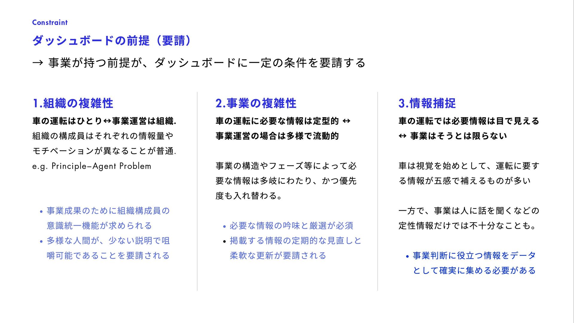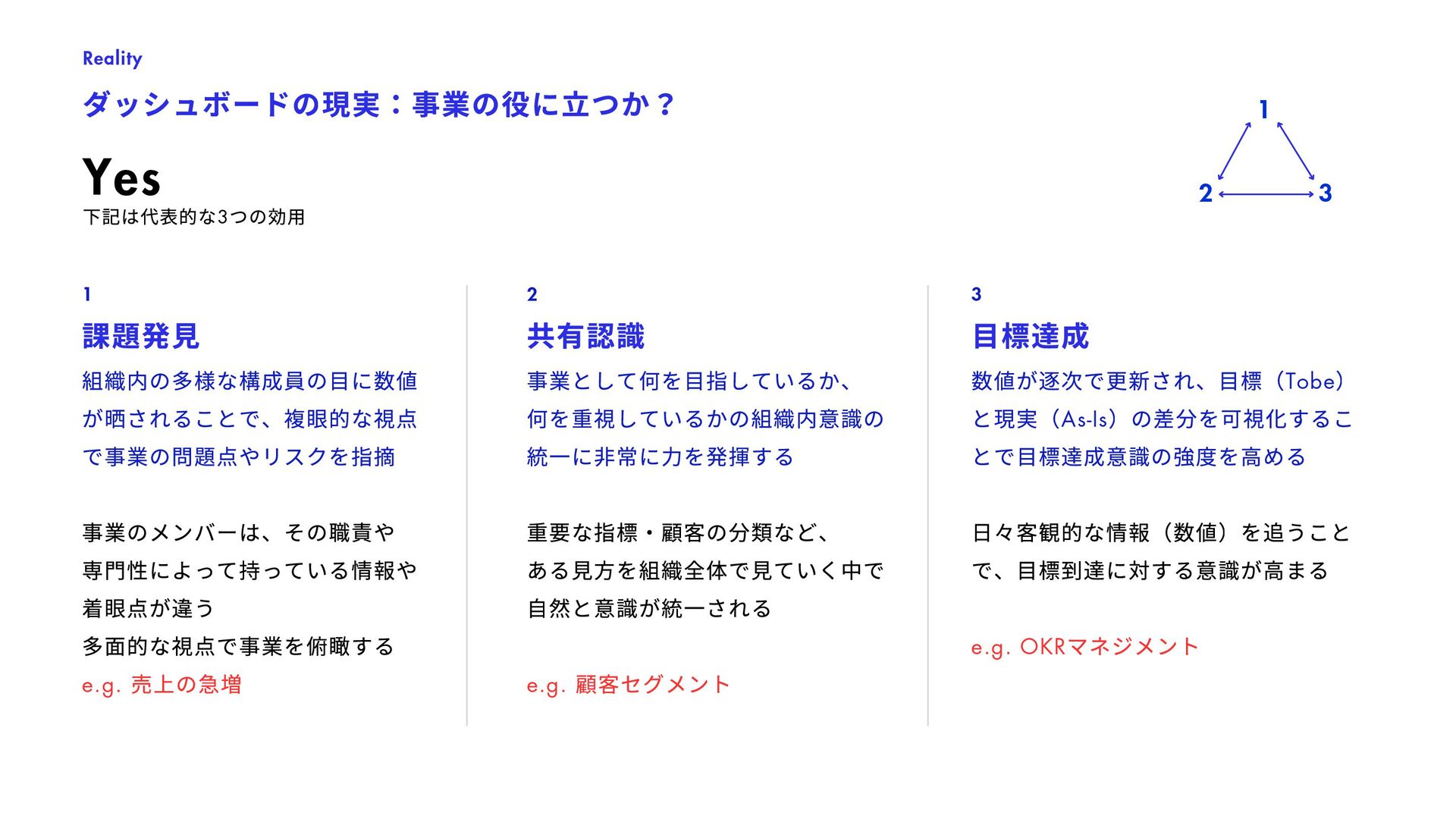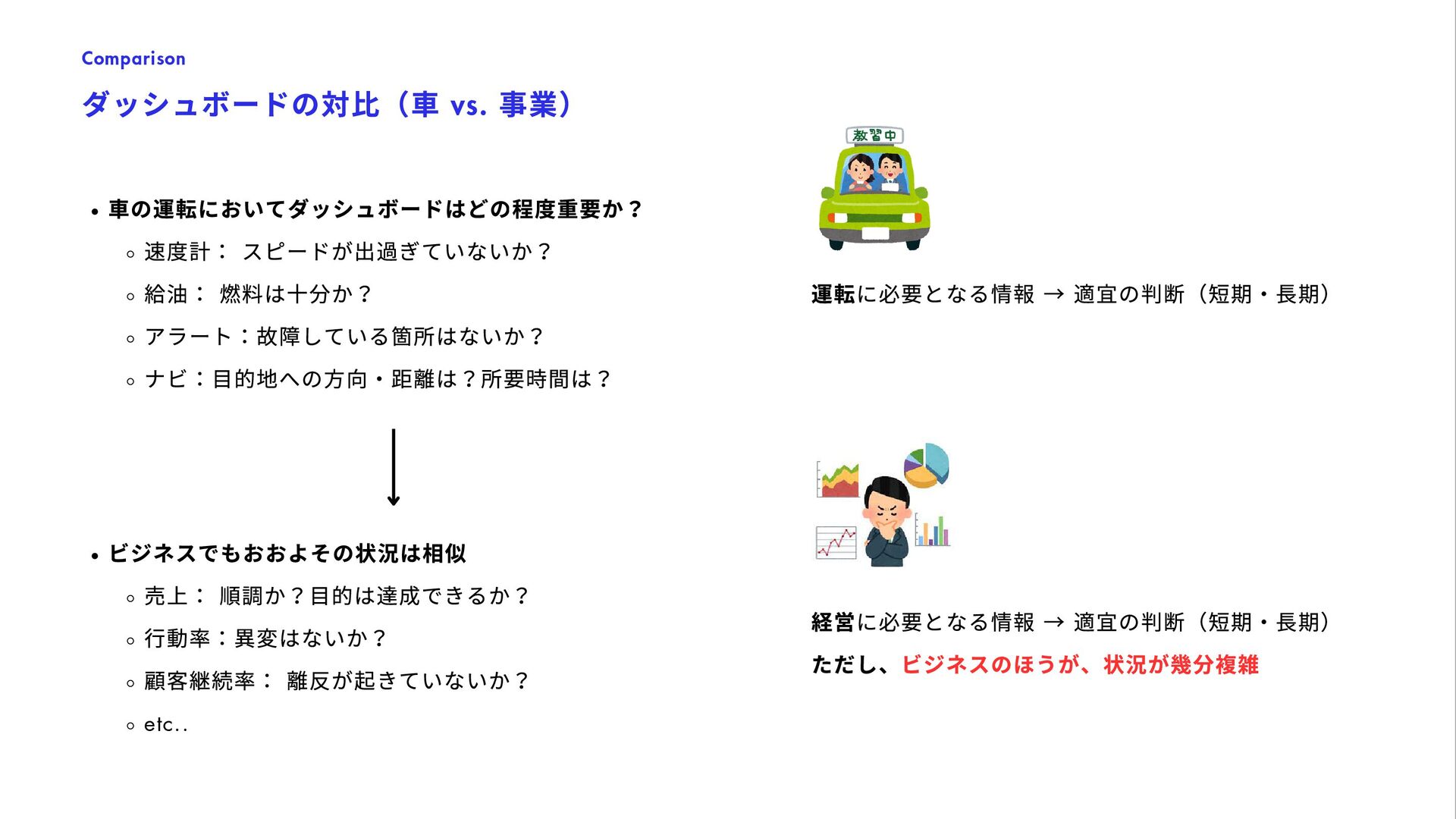 列 or 3 列でどちらが優れているか? ・どのような検索アルゴリズムが購買に好影響か? 機能のA/B テスト(RCT ) User Interface, 新機能, 検索アルゴリズム, etc. CRM Planning / Evaluation 新規顧客の獲得、 および顧客価値の最⼤化 ・5%/8% offのどちらのほうがビジネスに優位か? ・1000ptプレゼントはLTVベースでPay-Backしうるか? インセンティブ設計(推算) ・評価(RCT ) LTV Impact Estimate Business Planning/ Estimation 事業計画 ・どういった計画モデルが運営上で最適か? ・あるKPI の想定下でYoY 成長率はどうなるか? 事業計画のモデル化とKPI とのAlignment, KPI の感応度の分析・シナリオ分析 KPI Design 重要な事業計数(KPI )の 設計・浸透 ・事業の状況を理解するための最適なKPI の分解は? ・どういった事業数値を誰がいつ⾒るべきか? KPI モニタリング(ダッシュボード等) KPI 流通チャネルの設計 User Segmentation 最適なユーザ分類方法の 設計と事業適⽤ ・数百万いるユーザをどう分類するべきか? ・各セグメントごとにどういったCRM が最適か? ユーザセグメンテーション策定、運⽤ Strategic Insight 戦略・企画の方向性の材料と なる数値根拠の提供 ・利用の継続率 / 出品率を上げるために何が必要か? ・成長のための今後注力すべきカテゴリ/ 顧客区分は? 相関の分析、セグメントごとの数値評価 等 Investigation ⼀時的なトピックの分析 (多くはネガティブチェック) ・今週の売上が減少している理由はなにか? ・カテゴリAの優先度を下げた場合の売上毀損規模は? 単純な時系列分析、カテゴリ定量化 等 Exploration / Knowledge Base 施策の種となる⾃由な分析 / 過去の分析のメタ整理 ・迅速に購入が決定されるジャンルの特徴とは? ・売れやすい商品の特徴とは? イシューによって様々 1 5 3 7 2 6 4 8 継続的な タスク 瞬間的な タスク