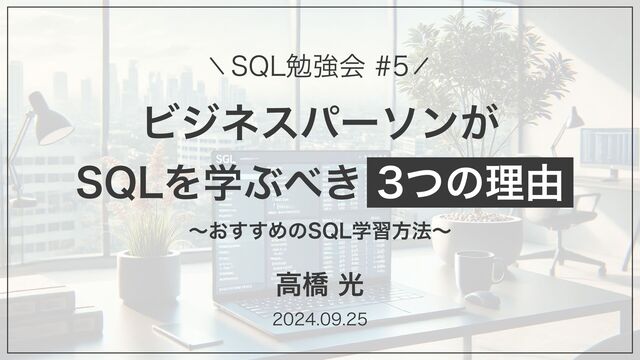 データの活用が必須の時代において、SQLを活用したデータ分析は非常に有効な手段です。今回は基本的なSQLの理解と共に、なぜSQLを学ぶ必要があるのか?ビジネスパーソンがSQLを覚えるとどんな良い事があるのか?効率よくSQLを学ぶにはどうすれば良いか?についてお話します。SQLは興味あるけど実際に学ぶ必要があるのかどうか知りたい方などぜひご参加ください。