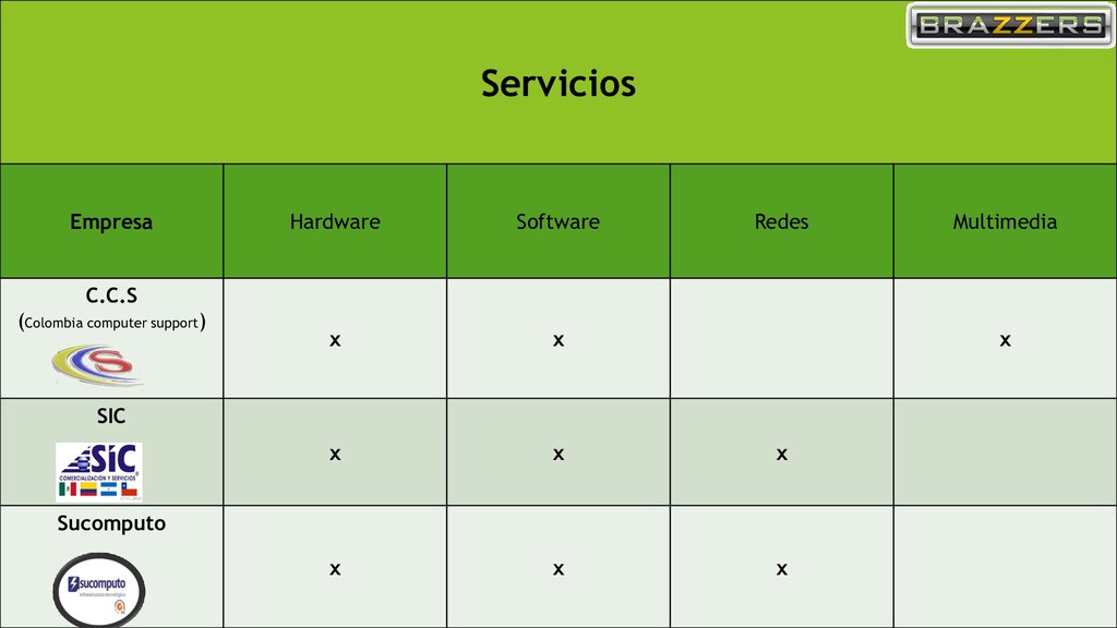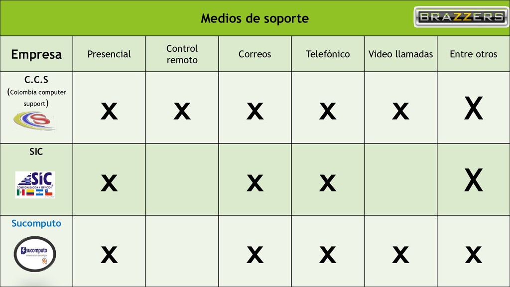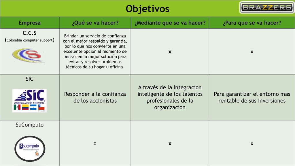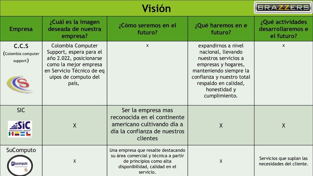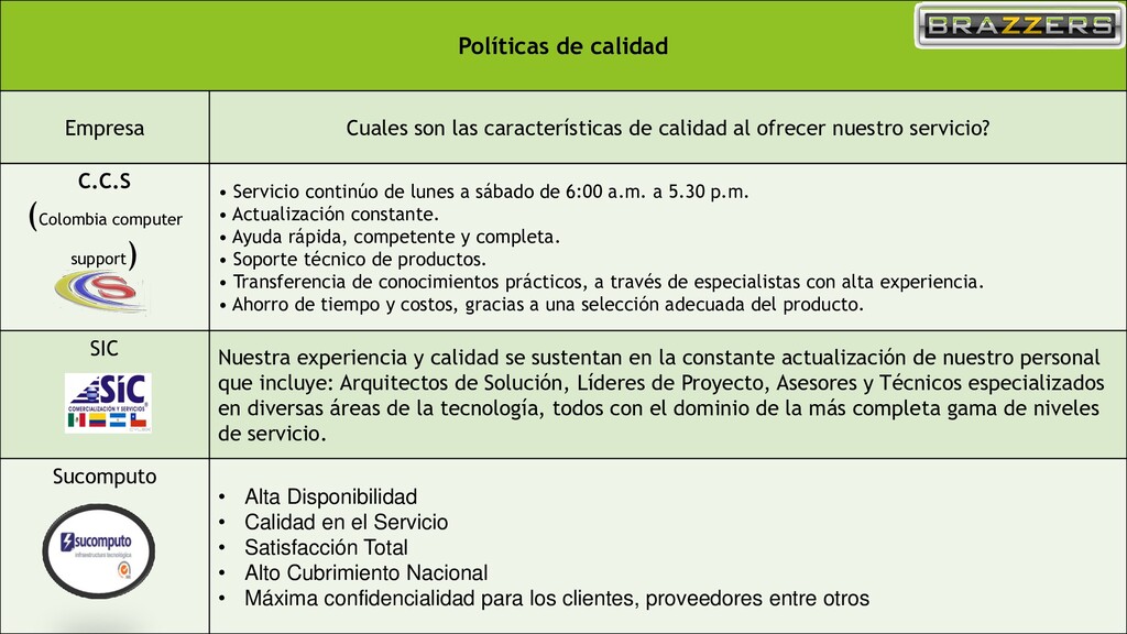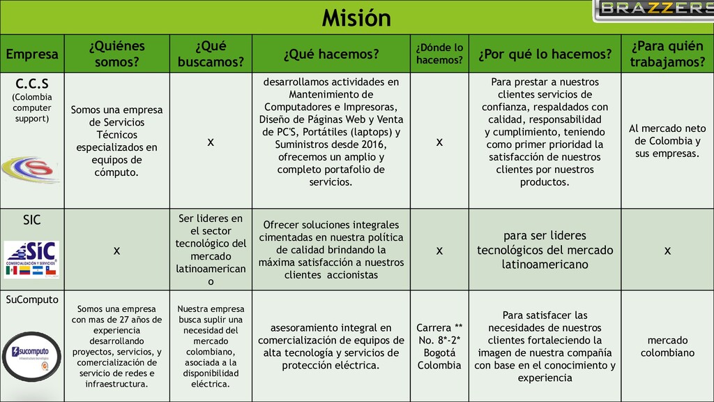 hacemos? ¿Por qué lo hacemos? ¿Para quién trabajamos? C.C.S (Colombia computer support) Somos una empresa de Servicios Técnicos especializados en equipos de cómputo. x desarrollamos actividades en Mantenimiento de Computadores e Impresoras, Diseño de Páginas Web y Venta de PC'S, Portátiles (laptops) y Suministros desde 2016, ofrecemos un amplio y completo portafolio de servicios. x Para prestar a nuestros clientes servicios de confianza, respaldados con calidad, responsabilidad y cumplimiento, teniendo como primer prioridad la satisfacción de nuestros clientes por nuestros productos. Al mercado neto de Colombia y sus empresas. SIC x Ser lideres en el sector tecnológico del mercado latinoamerican o Ofrecer soluciones integrales cimentadas en nuestra política de calidad brindando la máxima satisfacción a nuestros clientes accionistas x para ser lideres tecnológicos del mercado latinoamericano x SuComputo Somos una empresa con mas de 27 años de experiencia desarrollando proyectos, servicios, y comercialización de servicio de redes e infraestructura. Nuestra empresa busca suplir una necesidad del mercado colombiano, asociada a la disponibilidad eléctrica. asesoramiento integral en comercialización de equipos de alta tecnología y servicios de protección eléctrica. Carrera ** No. 8*-2* Bogotá Colombia Para satisfacer las necesidades de nuestros clientes fortaleciendo la imagen de nuestra compañía con base en el conocimiento y experiencia mercado colombiano