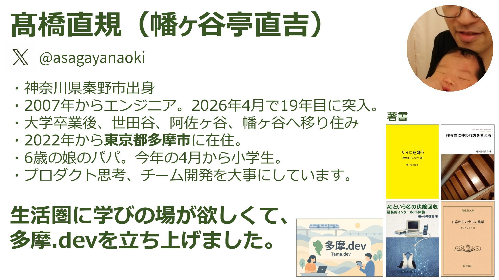 髙橋直規(幡ヶ谷亭直吉) @asagayanaoki 著書 ・神奈川県秦野市出身 ・2007年からエンジニア。2026年4月で19年目に突入。 ・大学卒業後、世田谷、阿佐ヶ谷、幡ヶ谷へ移り住み ・2022年から東京都多摩市に在住。 ・6歳の娘のパパ。今年の4月から小学生。 ・プロダクト思考、チーム開発を大事にしています。 生活圏に学びの場が欲しくて、