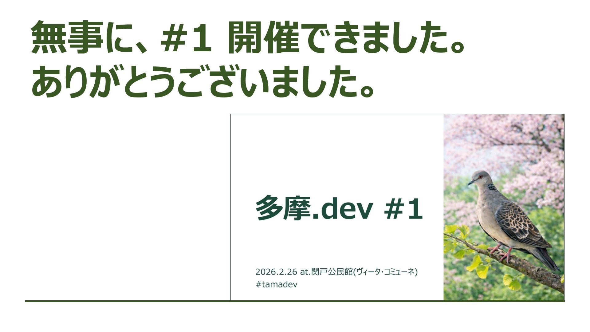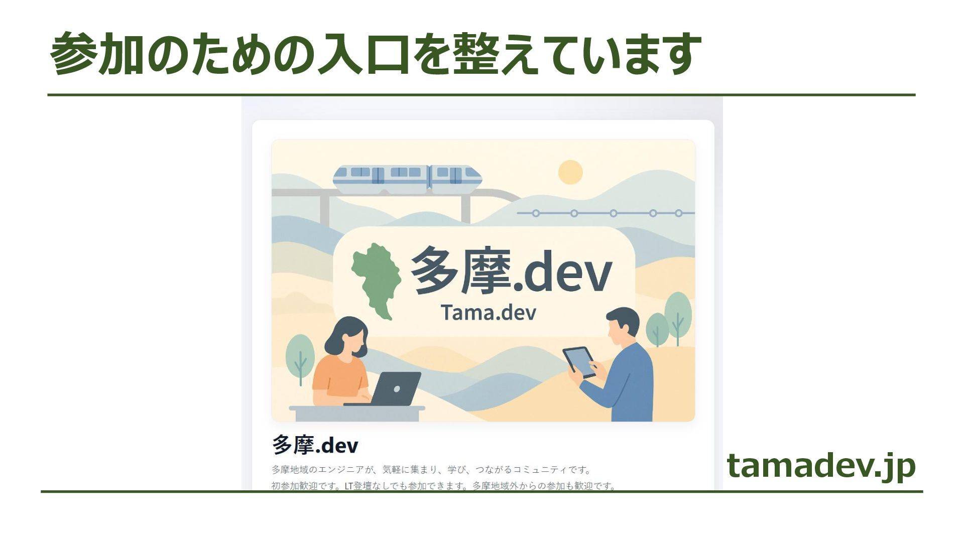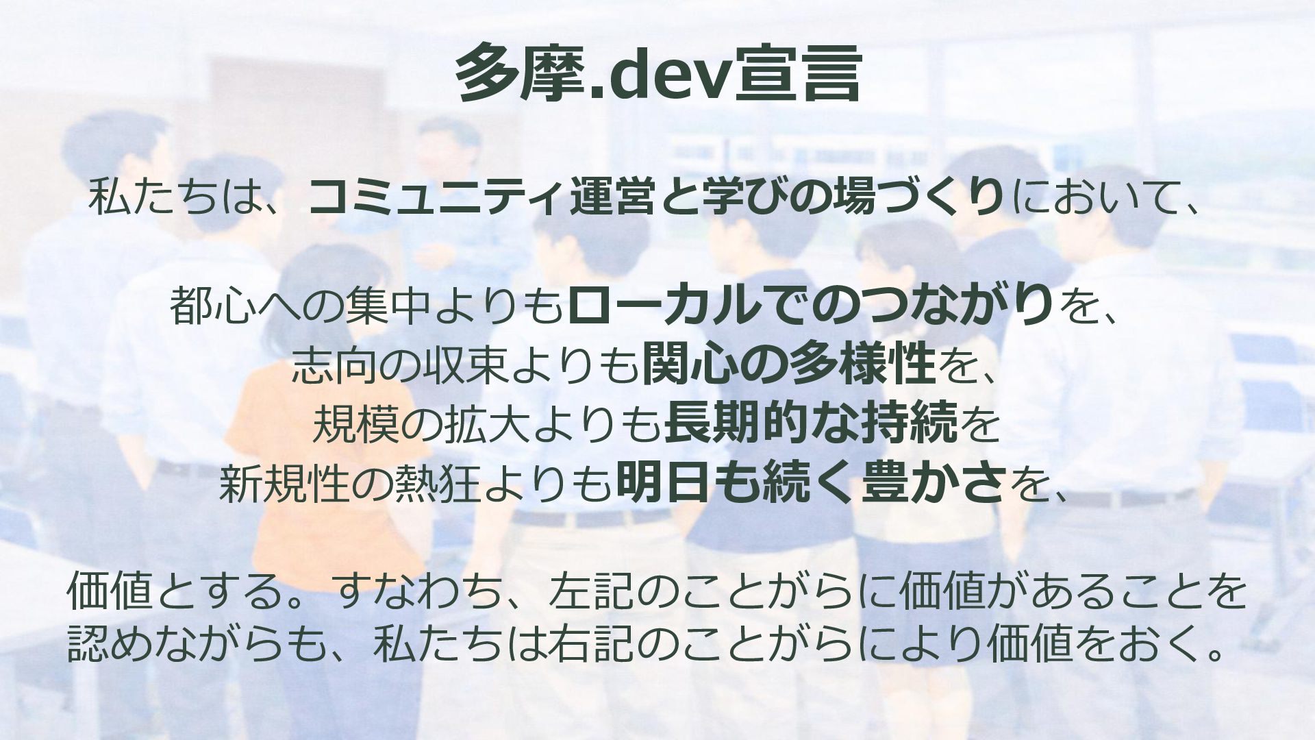 多摩.dev宣言 私たちは、コミュニティ運営と学びの場づくりにおいて、 都心への集中よりもローカルでのつながりを、 志向の収束よりも関心の多様性を、 規模の拡大よりも長期的な持続を 新規性の熱狂よりも明日も続く豊かさを、 価値とする。すなわち、左記のことがらに価値があることを 認めながらも、私たちは右記のことがらにより価値をおく。