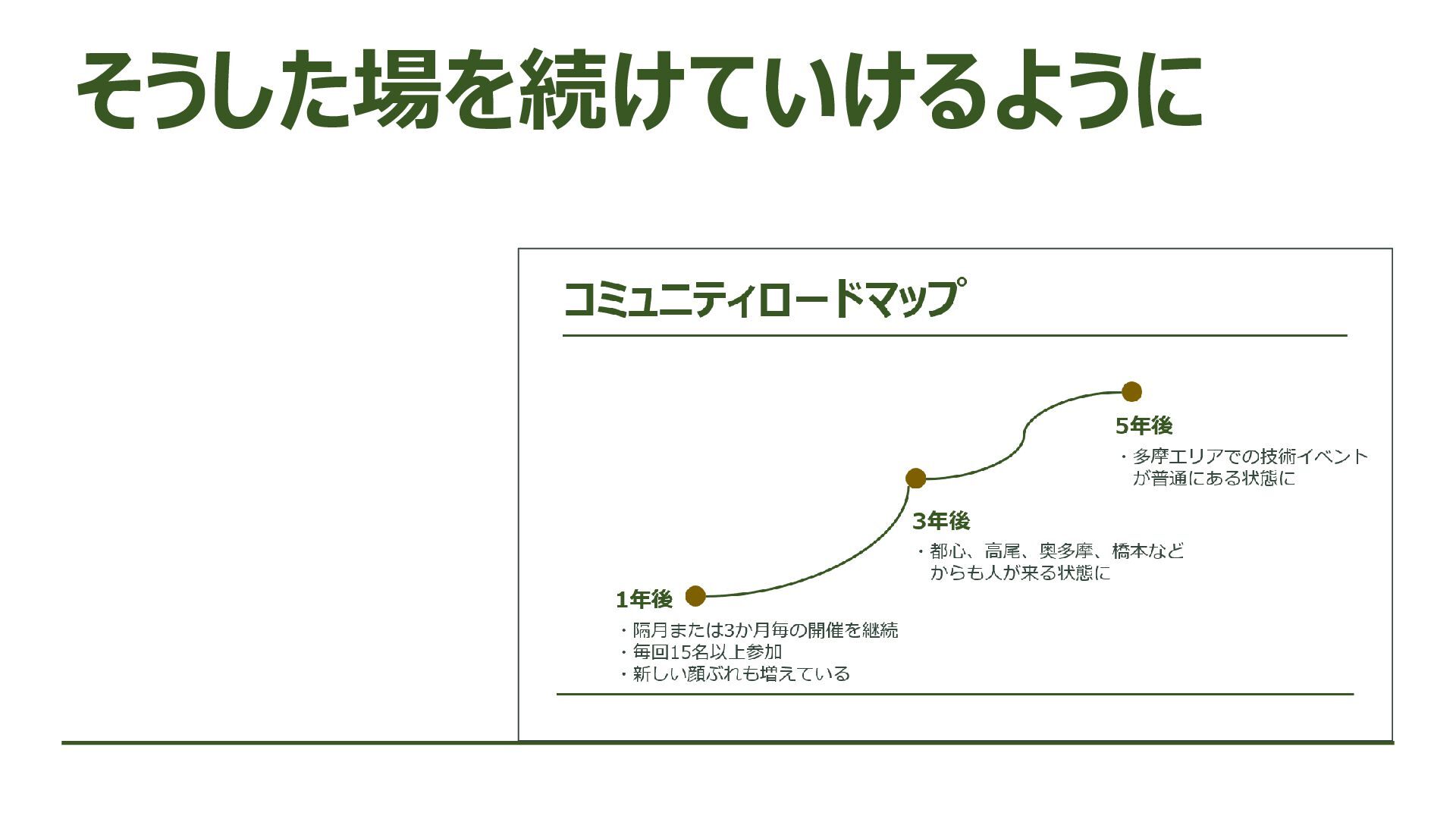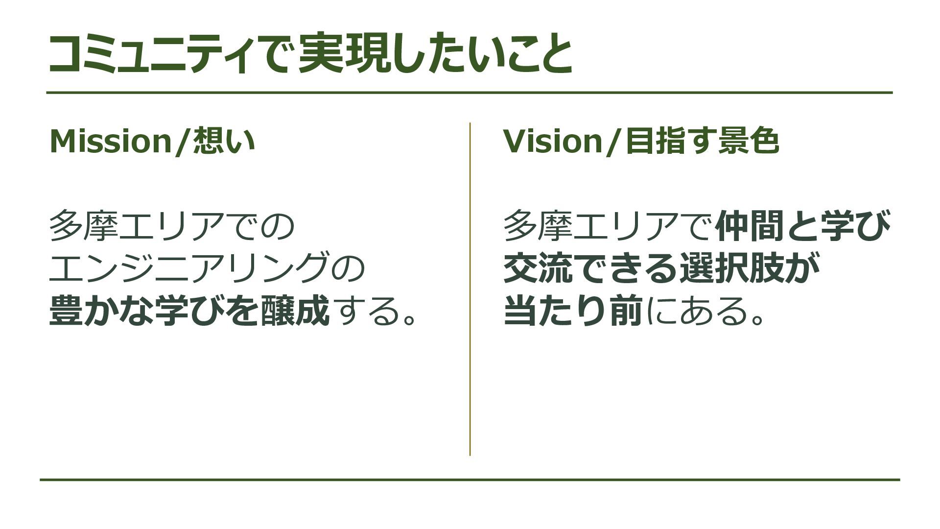 コミュニティで実現したいこと Mission/想い Vision/目指す景色 多摩エリアでの エンジニアリングの 豊かな学びを醸成する。 多摩エリアで仲間と学び 交流できる選択肢が 当たり前にある。