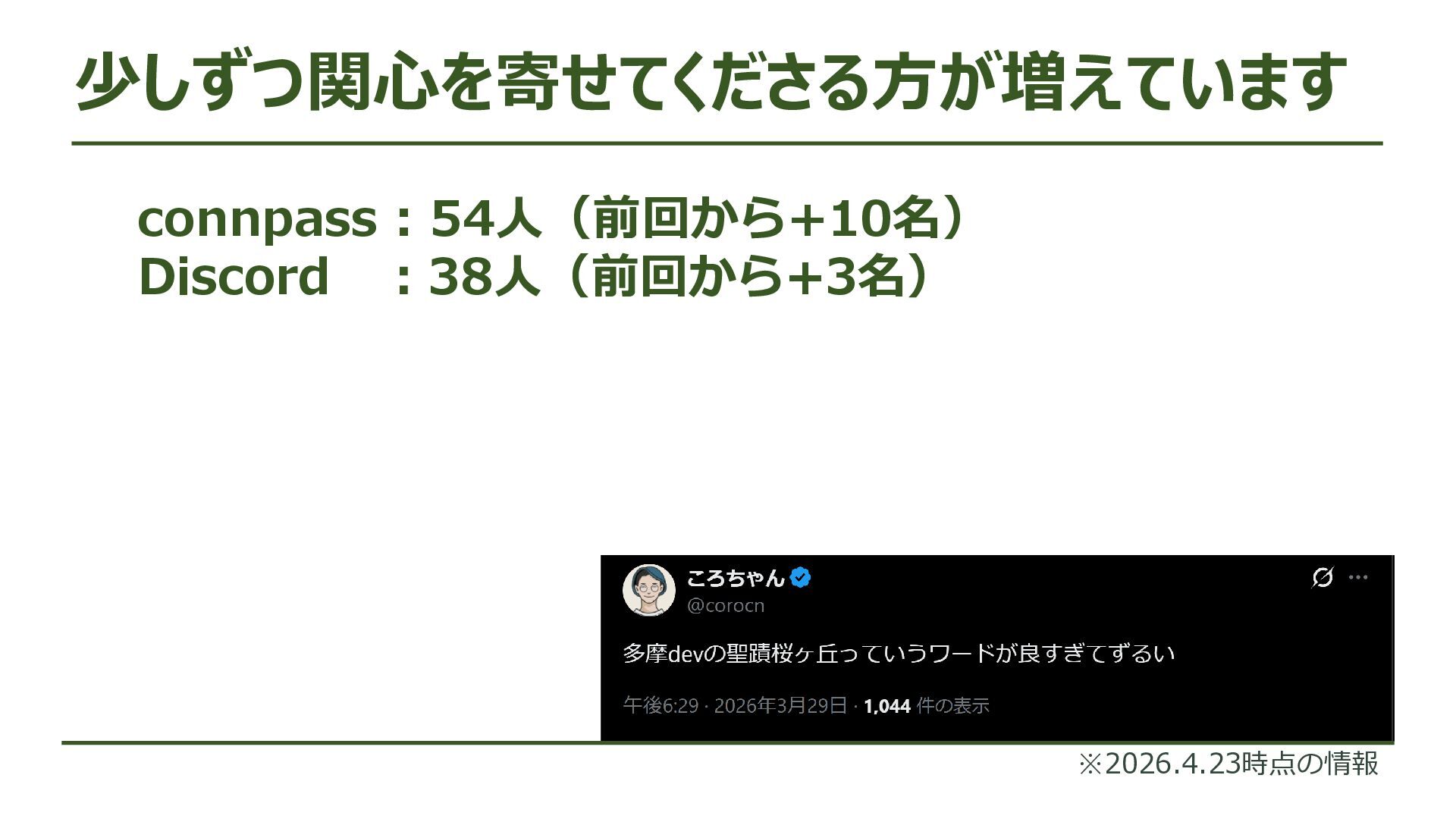 少しずつ関心を寄せてくださる方が増えています connpass : 54人(前回から+10名) Discord :38人(前回から+3名) ※2026.4.23時点の情報