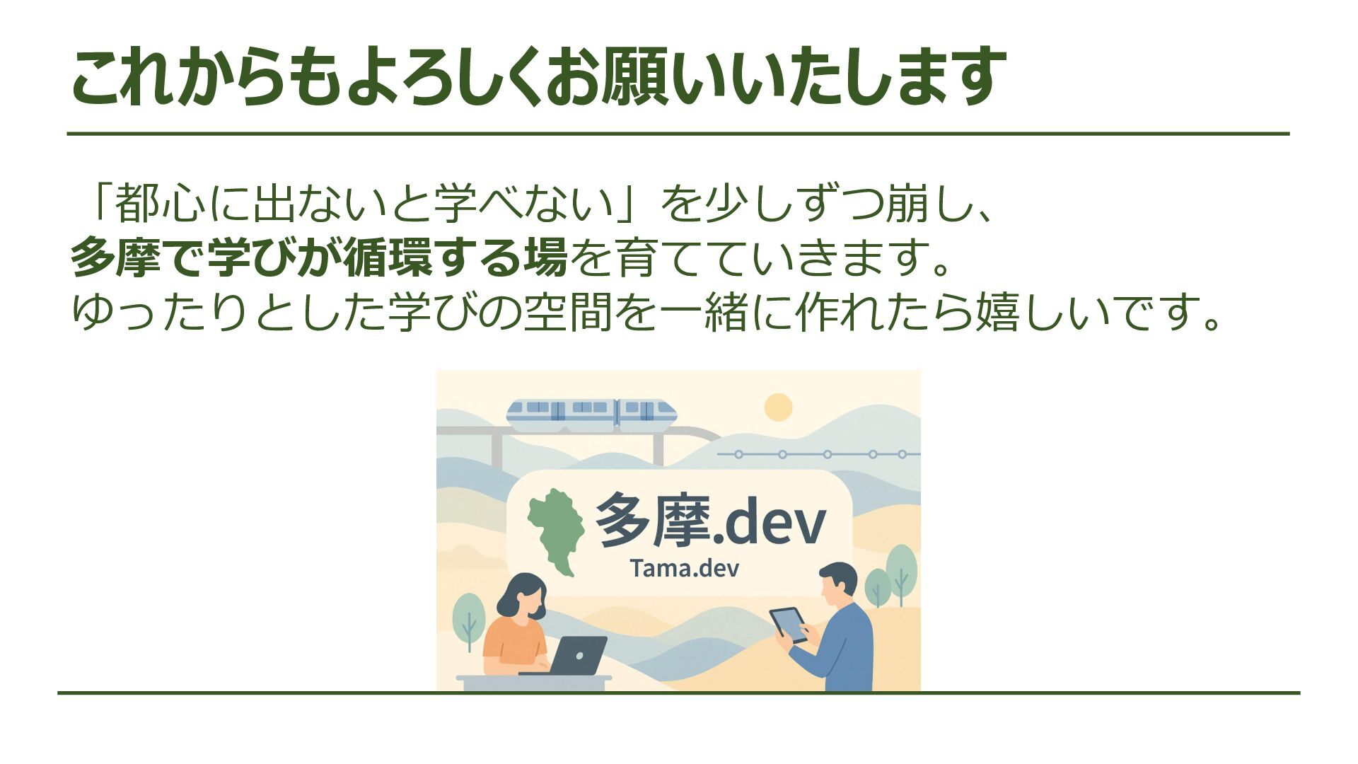 これからもよろしくお願いいたします 「都心に出ないと学べない」を少しずつ崩し、 多摩で学びが循環する場を育てていきます。 ゆったりとした学びの空間を一緒に作れたら嬉しいです。