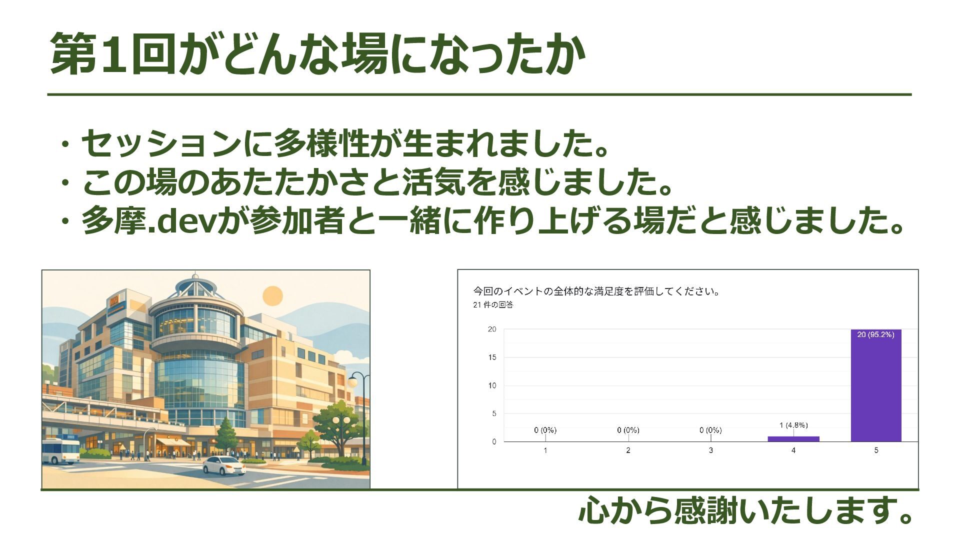 第1回がどんな場になったか ・セッションに多様性が生まれました。 ・この場のあたたかさと活気を感じました。 ・多摩.devが参加者と一緒に作り上げる場だと感じました。 心から感謝いたします。