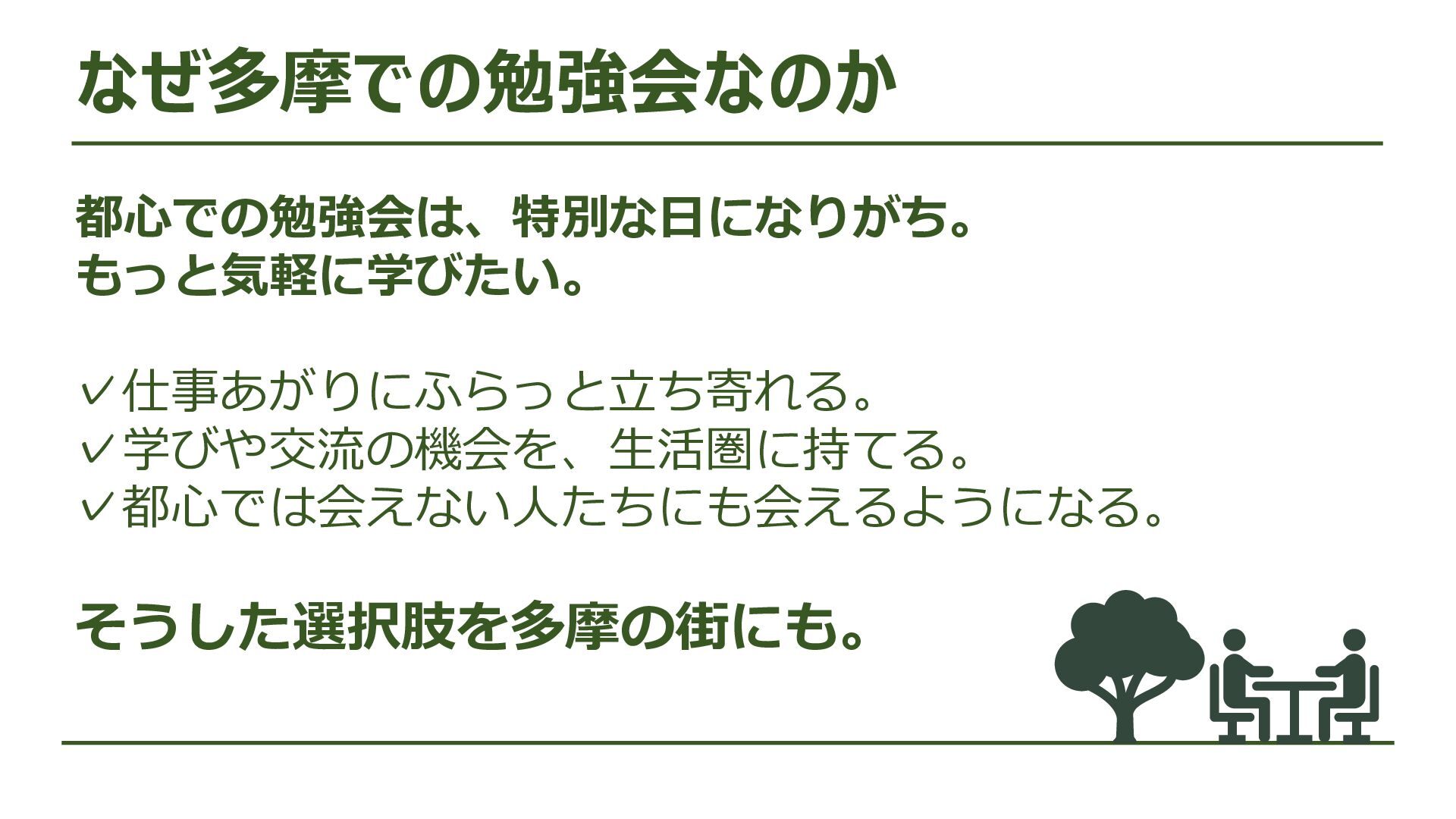 なぜ多摩での勉強会なのか 都心での勉強会は、特別な日になりがち。 もっと気軽に学びたい。 ✓仕事あがりにふらっと立ち寄れる。 ✓学びや交流の機会を、生活圏に持てる。 ✓都心では会えない人たちにも会えるようになる。 そうした選択肢を多摩の街にも。