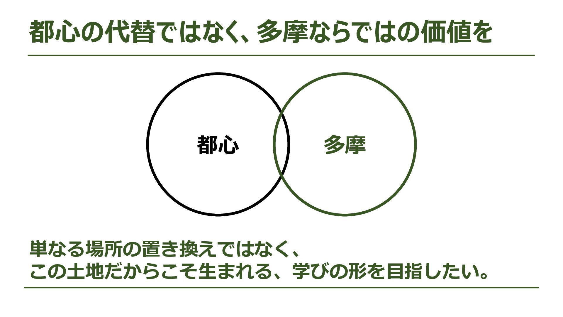 都心の代替ではなく、多摩ならではの価値を 単なる場所の置き換えではなく、 この土地だからこそ生まれる、学びの形を目指したい。 都心 多摩