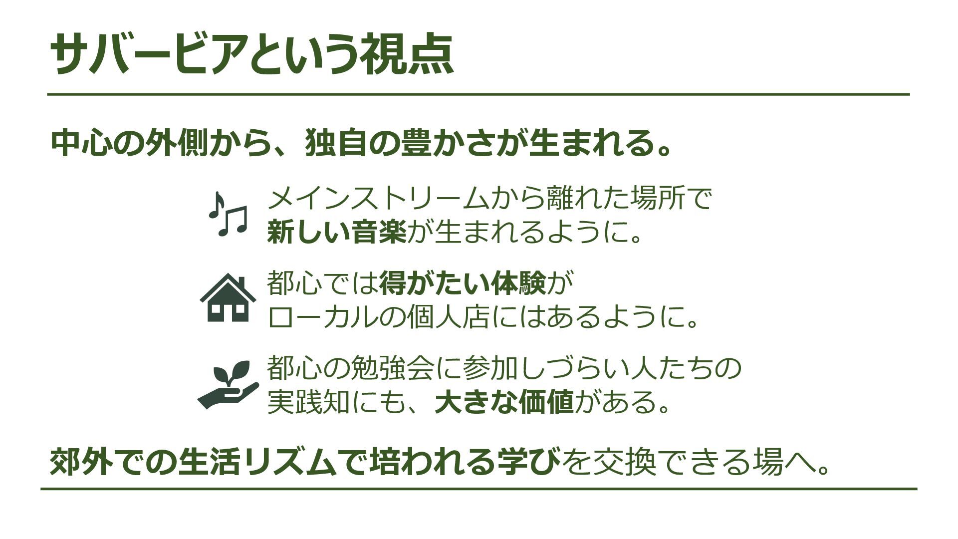 サバービアという視点 中心の外側から、独自の豊かさが生まれる。 郊外での生活リズムで培われる学びを交換できる場へ。 メインストリームから離れた場所で 新しい音楽が生まれるように。 都心では得がたい体験が ローカルの個人店にはあるように。 都心の勉強会に参加しづらい人たちの 実践知にも、大きな価値がある。