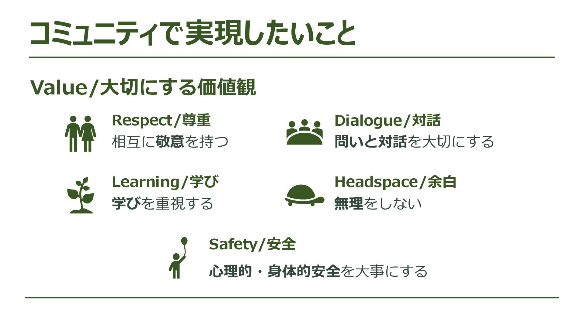 コミュニティで実現したいこと Value/大切にする価値観 Respect/尊重 Dialogue/対話 Learning/学び Headspace/余白 Safety/安全 相互に敬意を持つ 問いと対話を大切にする 学びを重視する