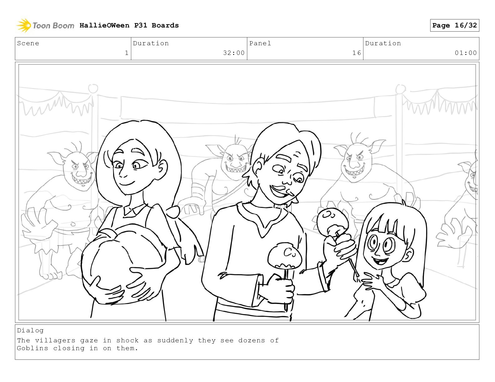 Scene 1 Duration 32:00 Panel 16 Duration 01:00 Dialog The