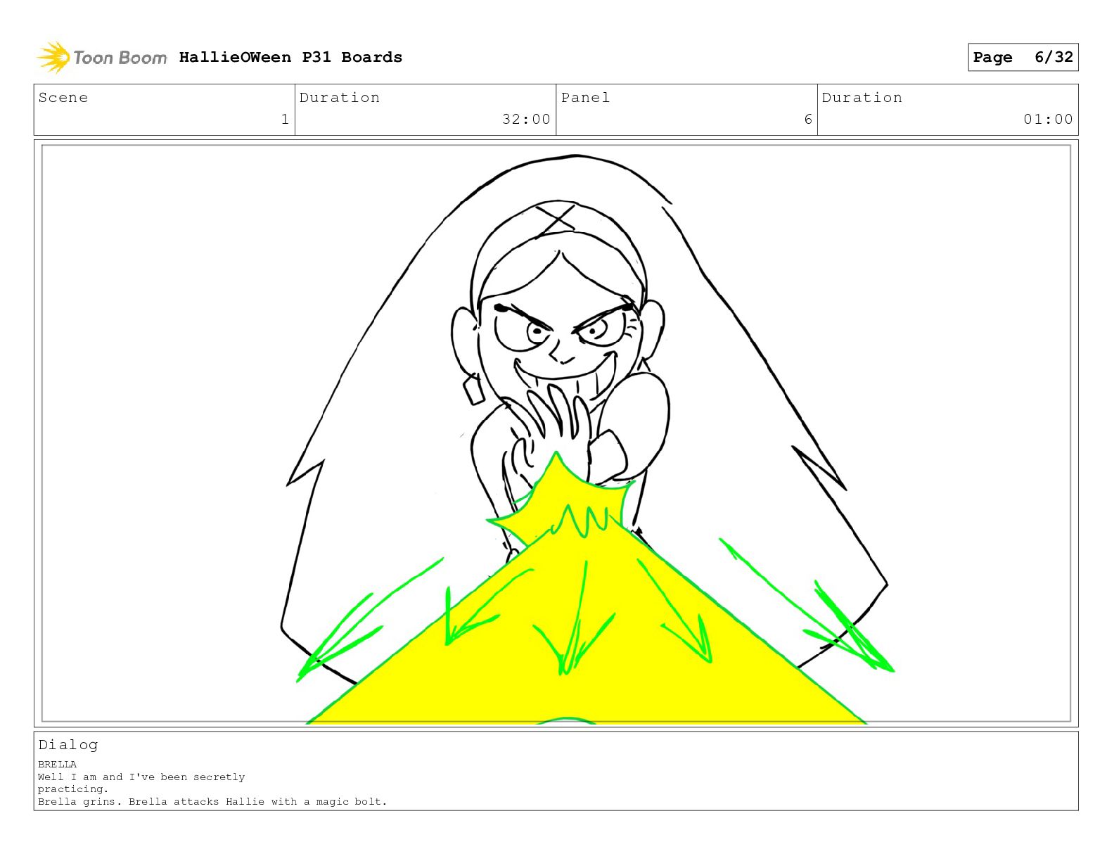 Scene 1 Duration 32:00 Panel 6 Duration 01:00 Dialog BRELLA