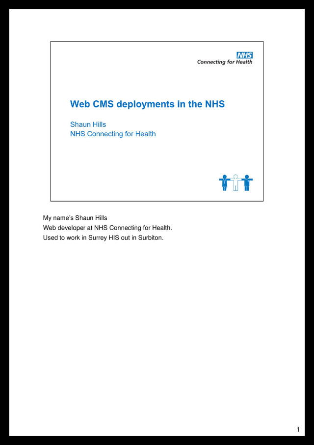 what it covers. Unfortunately this is going to be deliberately brief; our website content's slowly getting better, so I'd encourage you to have a look if you'd like to know more! •NPfIT isn’t delivery of standardised web systems like CMSes and hosting! outside NPfIT remit •We're happy to get/provide advice though •That's the theme of the rest of the presentation...