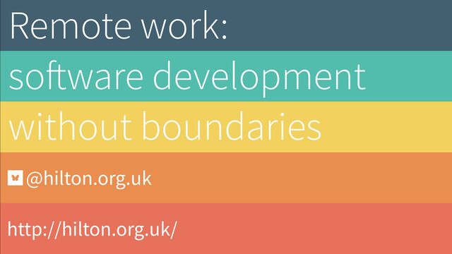 meetings short Replace recurring meetings with unplanned video calls Try team programming – work together without a meeting: FOMO for non-attendees, fun for attendees, even non coders Don’t use meetings for procedural work, e.g. planning tasks 21 @hilton.org.uk •