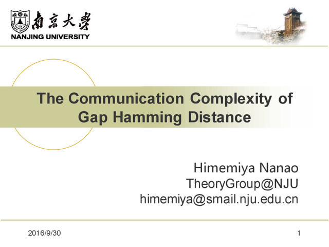 method. John Wiley & Sons, 2004. 2) Beame, Paul, et al. "A strong direct product theorem for corruption and the multiparty communication complexity of disjointness." Computational Complexity 15.4 (2006): 391-432. 3) Chakrabarti, Amit, and Oded Regev. "An optimal lower bound on the communication complexity of gap-hamming-distance." SIAM Journal on Computing 41.5 (2012): 1299-1317. 4) Sherstov, Alexander A. "The Communication Complexity of Gap Hamming Distance." Theory of Computing 8.1 (2012): 197-208. 5) Talagrand, Michel. "Concentration of measure and isoperimetric inequalities in product spaces." Publications Mathématiques de l'Institut des Hautes Etudes Scientifiques 81.1 (1995): 73-205. 6) Vidick, Thomas. "A concentration inequality for the overlap of a vector on a large set." (2011). 2016/9/30 24