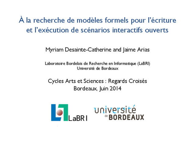 B C E A B C D E < WaitFromStart(ε,1,1), WaitFromStart(A,2,2) > < WaitFromStart(ε,3,3), WaitFromStart(B,2,2) > < WaitFromEnd(A,5,5) ∧ WaitFromEnd(B,3,3), WaitFromEnd(C.D,1,1) ∧ WaitFromEnd(C.E,1,1) > < WaitFromStart(C,2,5) ∧ WaitEvent(e1), WaitFromStart(C.D,1,1) > < WaitFromStart(C,1,1), WaitFromStart(C.E,2,2) > < True, EndScenario > r1 r2 r3 r4 r5 r6 D r7 r8 r9 M. Desainte-Catherine and J. Arias (LaBRI) À la recherche de modèles formels pour l’écriture et l’exécution de scénarios 12/13 12/13