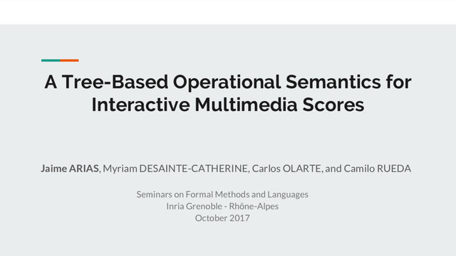 C. (2015). Foundations for Reliable and Flexible Interactive Multimedia Scores. In T. Collins, D. Meredith, & A. Volk (Eds.), 5th International Conference on Mathematics and Computation in Music, MCM 2015, London, UK, June 22-25, 2015 (Vol. 9110, pp. 29–41). Springer. https://doi.org/10.1007/978-3-319-20603-5_3 2. Allombert, A. (2009). Aspects Temporels d’un Système de Partitions Musicales Interactives pour la Composition et l’Exécution. Université de Bordeaux. Retrieved from http://ori-oai.u-bordeaux1.fr/pdf/2009/ALLOMBERT_ANTOINE_2009.pdf 3. Olarte, C., & Rueda, C. (2009). A Declarative Language for Dynamic Multimedia Interaction Systems. In E. Chew, A. Childs, & C.-H. Chuan (Eds.), 2nd International Conference on Mathematics and Computation in Music, MCM 2009, New Haven, CT, USA, June 19-22, 2009 (Vol. 38, pp. 218–227). Springer Berlin Heidelberg. https://doi.org/10.1007/978-3-642-02394-1_20 4. Toro, M., Desainte-Catherine, M., & Rueda, C. (2014). Formal semantics for interactive music scores: a framework to design, specify properties and execute interactive scenarios. Journal of Mathematics and Music, 8(1), 93–112. https://doi.org/10.1080/17459737.2013.870610 31