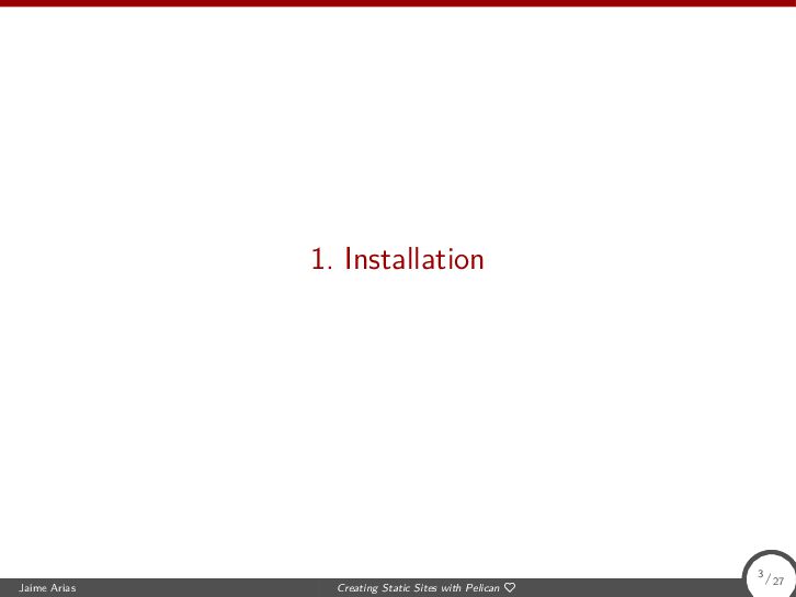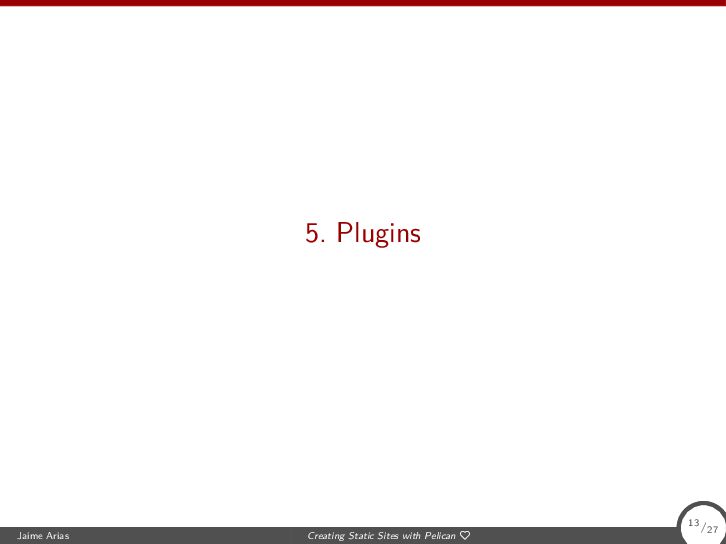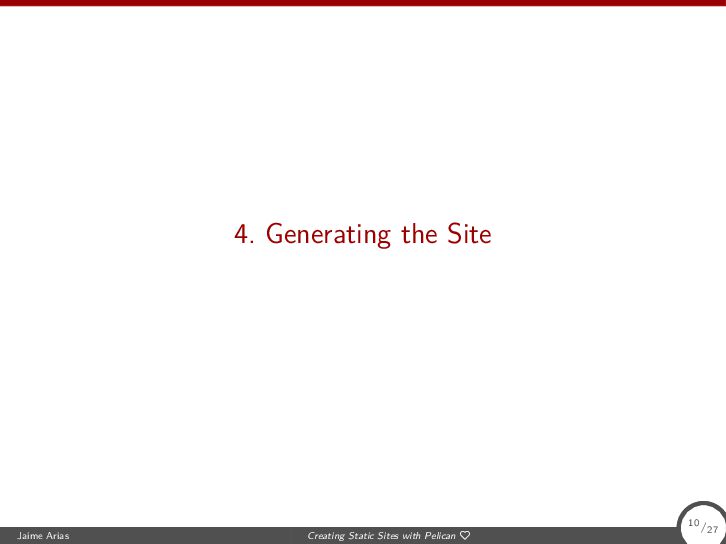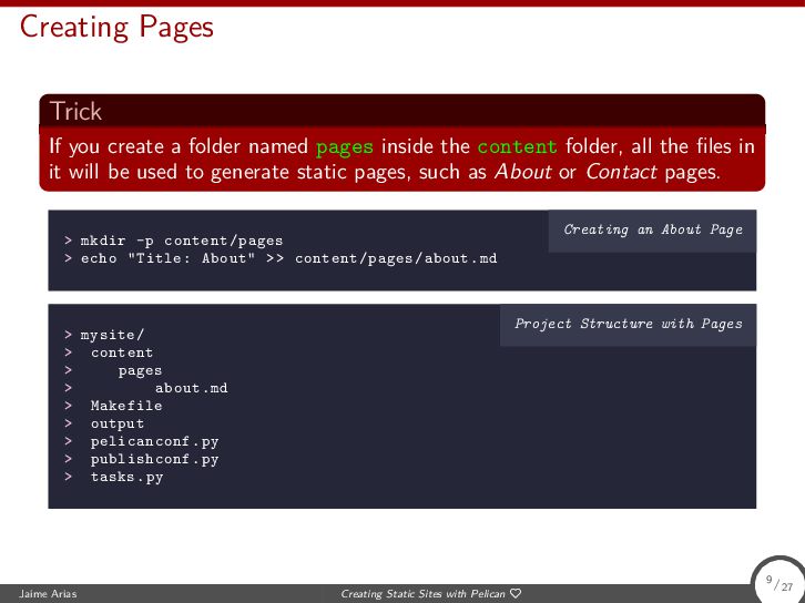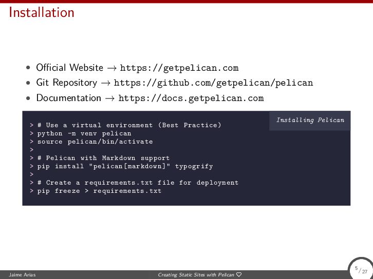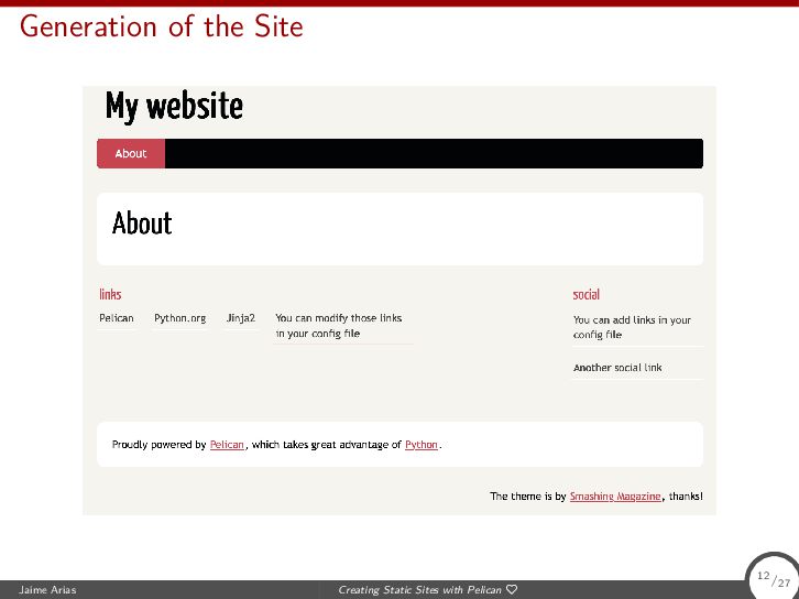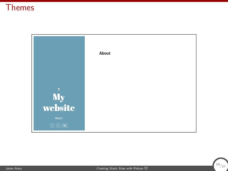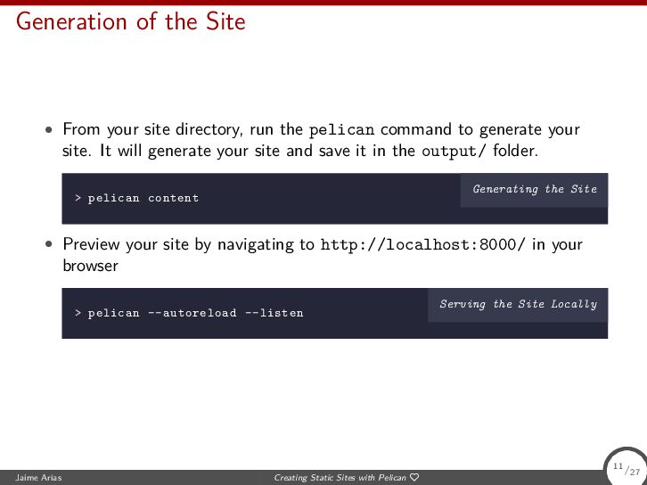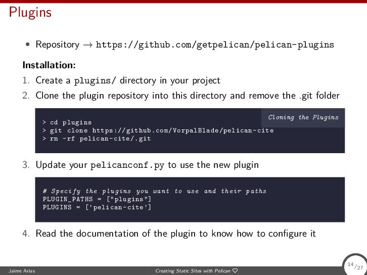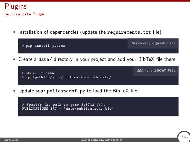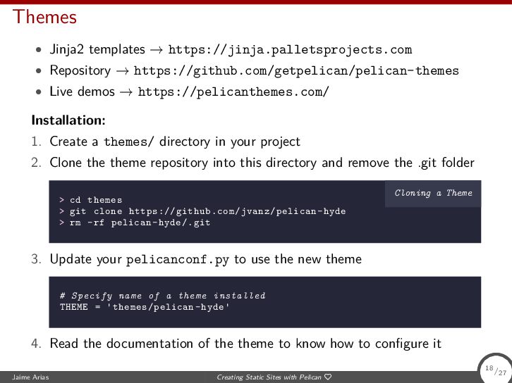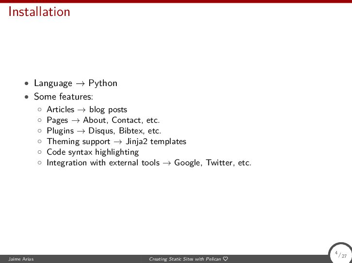 → blog posts ◦ Pages → About, Contact, etc. ◦ Plugins → Disqus, Bibtex, etc. ◦ Theming support → Jinja2 templates ◦ Code syntax highlighting ◦ Integration with external tools → Google, Twitter, etc. Jaime Arias Creating Static Sites with Pelican B 4 /27