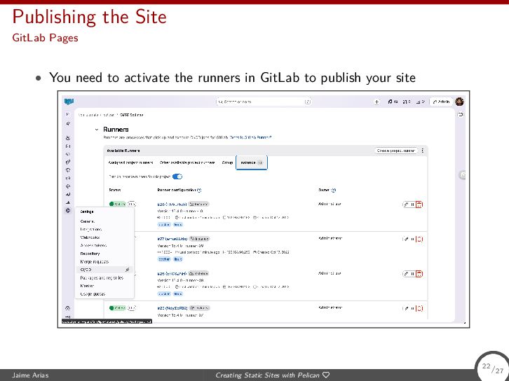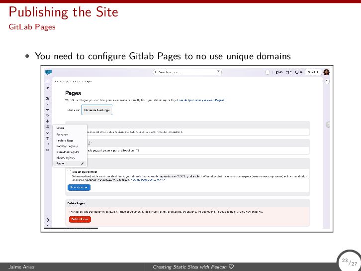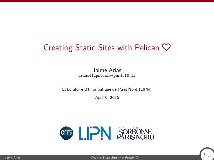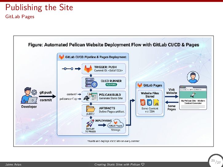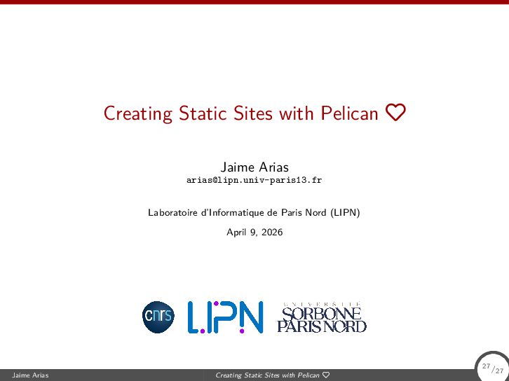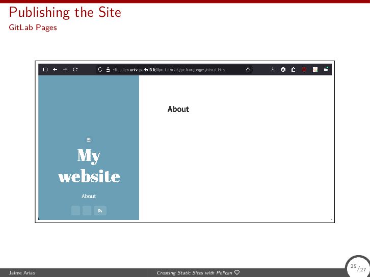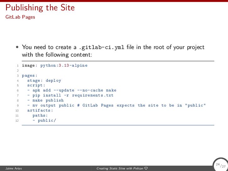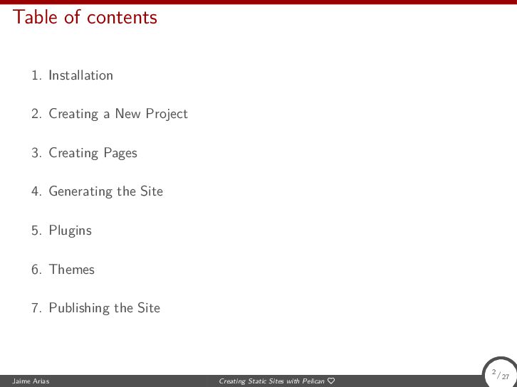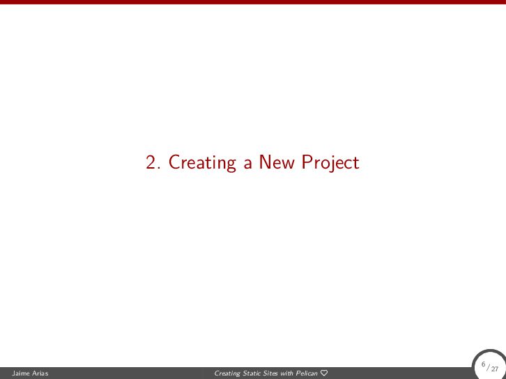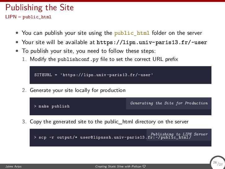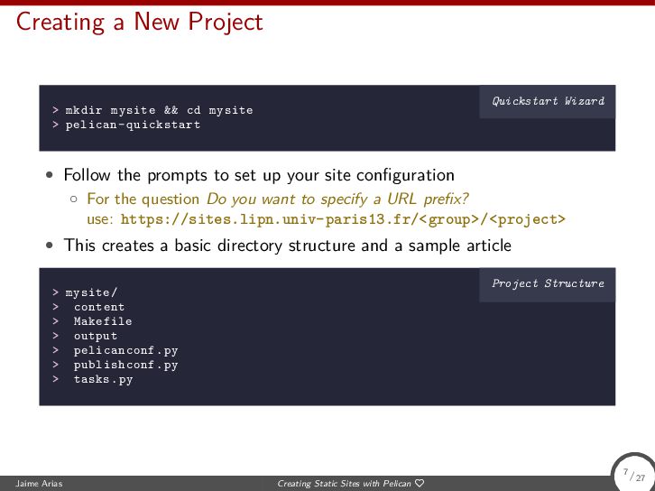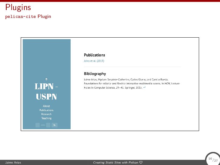 → blog posts ◦ Pages → About, Contact, etc. ◦ Plugins → Disqus, Bibtex, etc. ◦ Theming support → Jinja2 templates ◦ Code syntax highlighting ◦ Integration with external tools → Google, Twitter, etc. Jaime Arias Creating Static Sites with Pelican B 4 /27