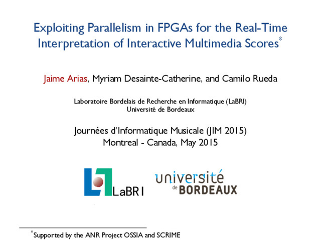 Tools, and Application Domains of FPGAs. IEEE Transactions on Industrial Electronics, 54(4):1810–1823, August 2007. Robert Trausmuth, Christian Dusek, and Yann Orlarey. Using FAUST for FPGA Programming. In Proceedings of the 9th International Conference on Digital Audio Effects, pages 18–20, 2006. David Wessel and Matthew Wright. Problems and prospects for intimate musical control of computers. In Ivan Poupyrev, Michael J. Lyons, Sidney Fels, and Tina Blaine, editors, New Interfaces for Musical Expression, NIME-01, Proceedings, Seattle, April 1-2, 2001, pages 11–14, 2001.