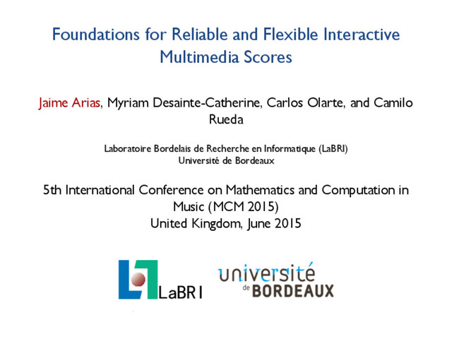 I, t⟩ |= cs(n) ⟨St, O⟩I,t S −→P ⟨start(St, p, t), O ∪ {ms(n)}⟩I,t S where n = targetP(p) RSTOP p ∈ canStop(S) ⟨P, S, I, t⟩ |= ce(n) ⟨St, O⟩I,t S −→P ⟨stop(St, p, t), O ∪ {me(n)}⟩I,t S where n = targetP(p) RTIME ⟨S, ∅⟩I,t S −→∗ P ⟨S′, O⟩I,t S ̸ −→P ⟨S, t⟩ I,O =⇒P ⟨S′, t + 1⟩ Arias, Desainte-Catherine, Olarte, and Rueda (LaBRI) Foundations for Reliable and Flexible Interactive Multimedia Scores 9/13 9/13