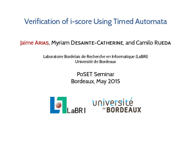 skipped finished killed flexible semi flexible t ≥ 0, event_s?, {t = 0} true, skip_p?, ∅ true, skip!, {t = 0} true, event_e2!, {t = 0} true, kill!, {t = 0} true, kill_p?, ∅ true, kill_p?, ∅ true, event _i?, ∅ true, kill_p?, ∅ true, event _i?, ∅ t = γ1 , τ, ∅ true, kill_ p?, ∅ t = γ0 ∧ finite = false, event_e1!, ∅ t = γ0 ∧ finite = true, event_e1 !, ∅ time (s) 0 1 2 3 4 5 6 Texture A Texture B γ0 = 8 γ1 = 24 finite = true t = 12 Arias, Desainte-Catherine, and Rueda (LaBRI) Verification of i-score Using Timed Automata 1/5 1 /5