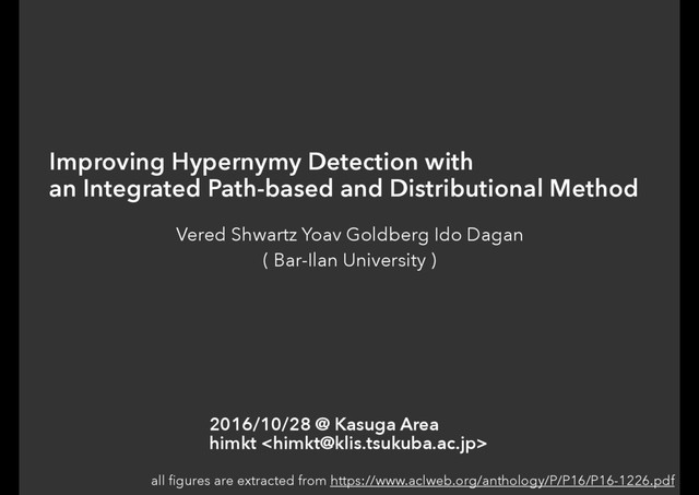 Shan. 2012. Entailment above the word level in distributional semantics. In EACL, pages 23–32. [2] Stephen Roller, Katrin Erk, and Gemma Boleda. 2014. Inclusive yet selective: Supervised distributional hypernymy detection. In COLING, pages 1025–1036 [3] Julie Weeds, Daoud Clarke, Jeremy Reffin, David Weir, and Bill Keller. 2014. Learning to distinguish hypernyms and co-hyponyms. In COLING, pages 2249–2259. [4] Rion Snow, Daniel Jurafsky, and Andrew Y Ng. 2004. Learning syntactic patterns for automatic hypernym discovery. In NIPS. [5] Ndapandula Nakashole, Gerhard Weikum, and Fabian Suchanek. 2012. Patty: a taxonomy of relational patterns with semantic types. In EMNLP and CoNLL, pages 1135– 1145. 11