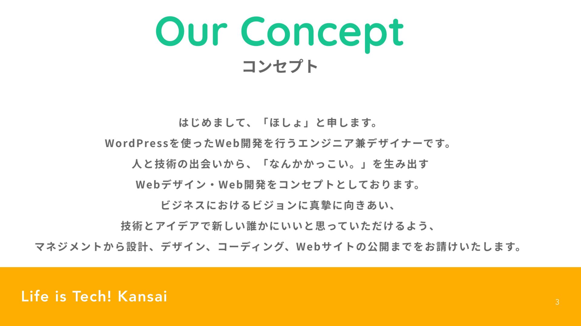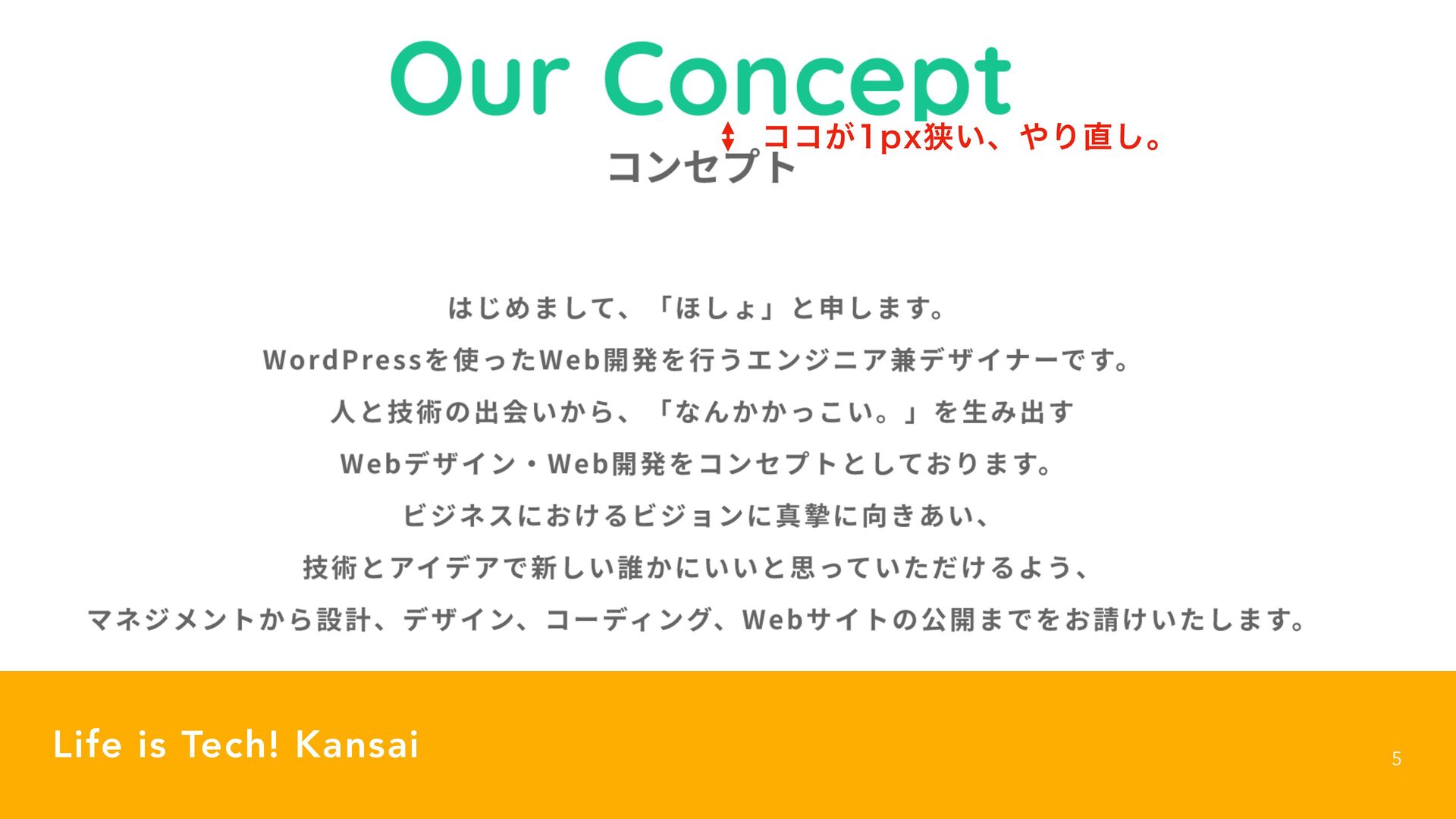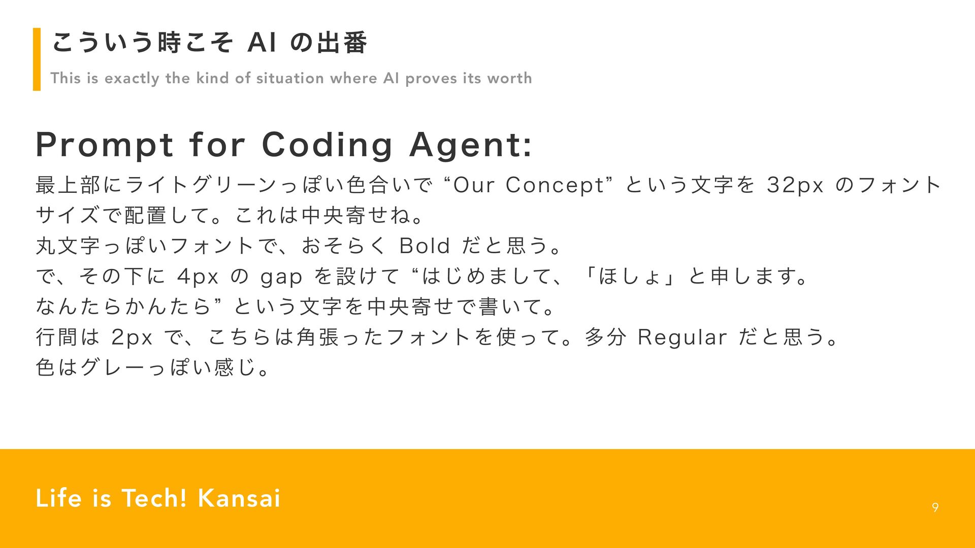 proves its worth 9 Life is Tech! Kansai 1SPNQUGPS$PEJOH"HFOU ࠷্෦ʹϥΠτάϦʔϯͬΆ͍৭߹͍Ͱl0VS$PODFQUzͱ͍͏จࣈΛQYͷϑΥϯτ αΠζͰஔͯ͠ɻ͜ΕதԝدͤͶɻ ؙจࣈͬΆ͍ϑΥϯτͰɺ͓ͦΒ͘#PMEͩͱࢥ͏ɻ ͰɺͦͷԼʹQYͷHBQΛઃ͚ͯl͡Ί·ͯ͠ɺʮ΄͠ΐʯͱਃ͠·͢ɻ ͳΜͨΒ͔ΜͨΒzͱ͍͏จࣈΛதԝدͤͰॻ͍ͯɻ ߦؒQYͰɺͪ͜Β֯ுͬͨϑΥϯτΛͬͯɻଟ3FHVMBSͩͱࢥ͏ɻ ৭άϨʔͬΆ͍ײ͡ɻ