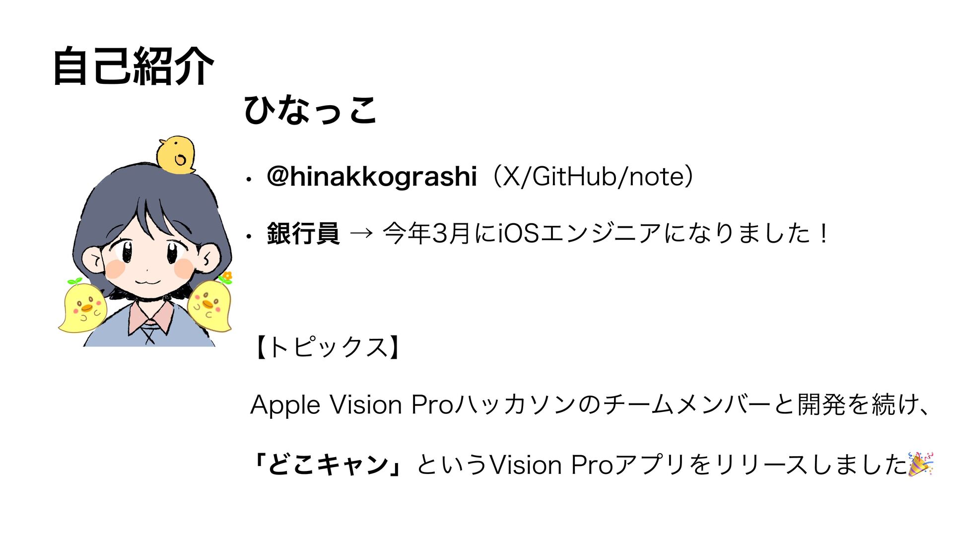 ࣗݾհ ͻͳͬ͜ w !IJOBLLPHSBTIJʢ9(JU)VCOPUFʣ w ۜߦһˠࠓ݄ʹJ04ΤϯδχΞʹͳΓ·ͨ͠ʂ ʲτϐοΫεʳ "QQMF7JTJPO1SPϋοΧιϯͷνʔϜϝϯόʔͱ։ൃΛଓ͚ɺ ʮͲ͜Ωϟϯʯͱ͍͏7JTJPO1SPΞϓϦΛϦϦʔε͠·ͨ͠🎉