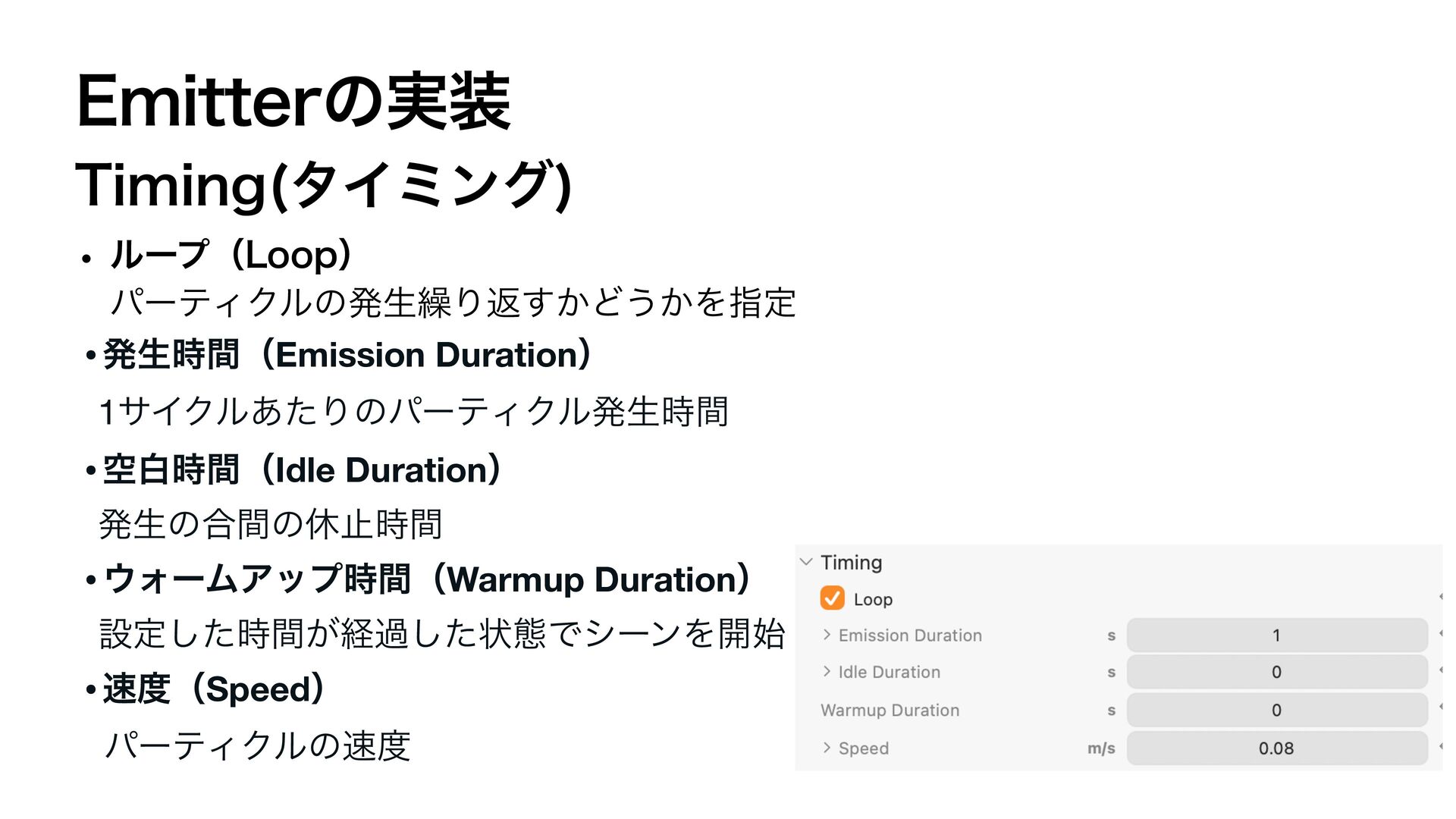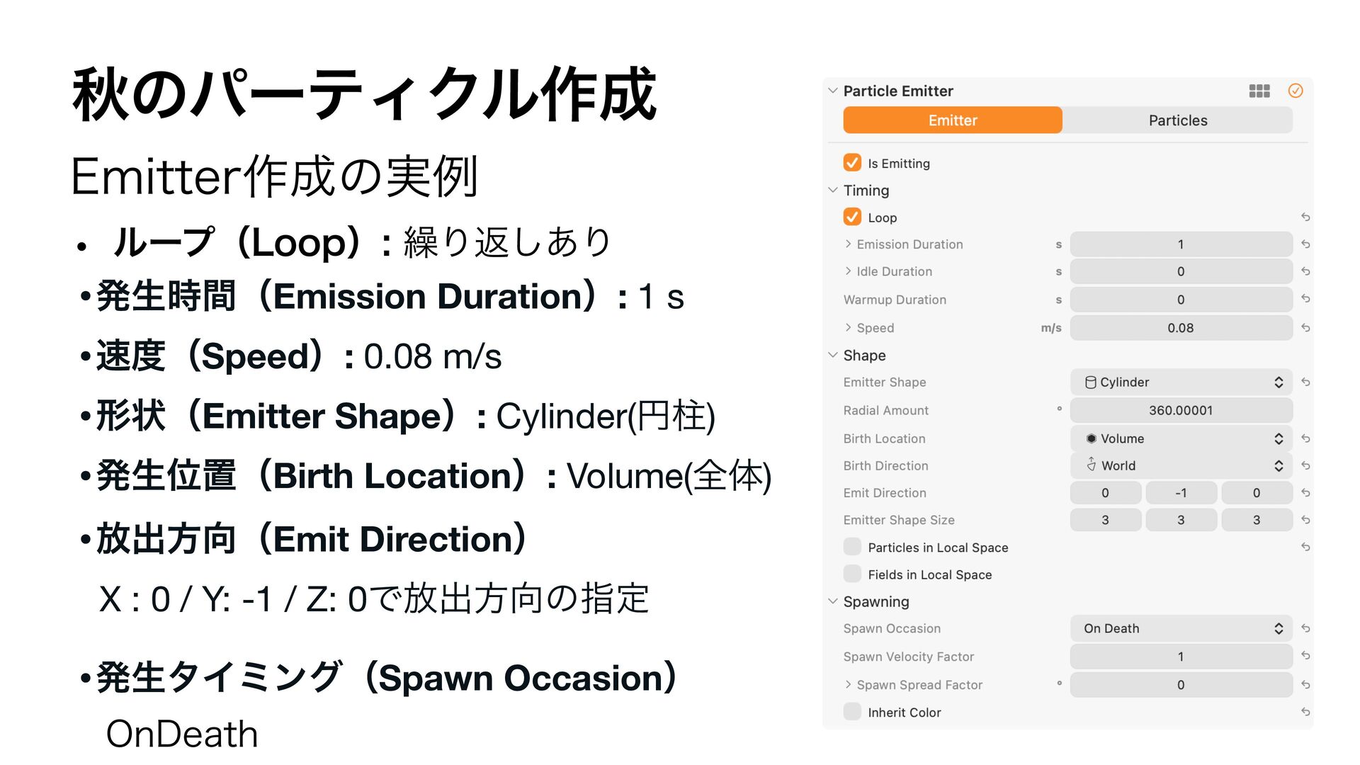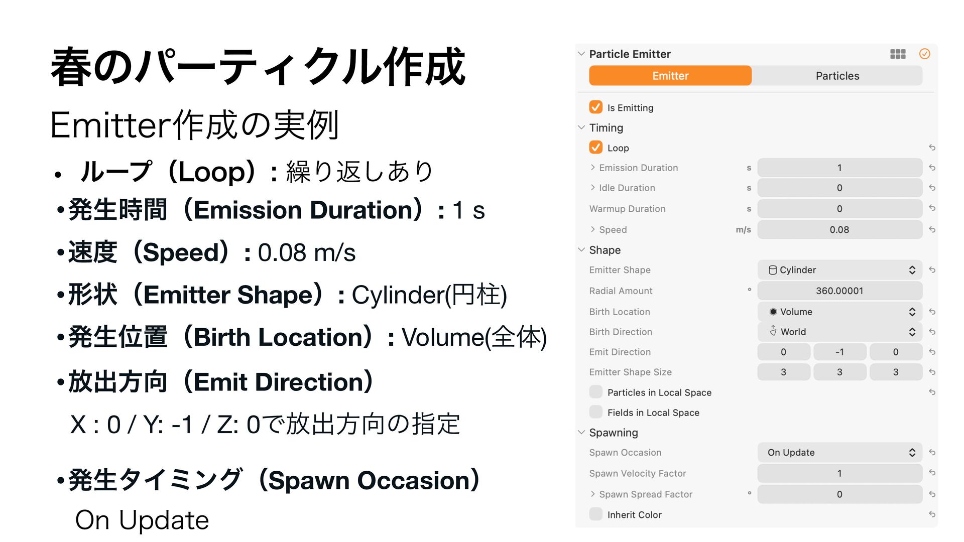 य़ͷύʔςΟΫϧ࡞ &NJUUFS࡞ͷ࣮ྫ w ϧʔϓʢ-PPQʣ܁Γฦ͋͠Γ •ൃੜ࣌ؒʢEmission Durationʣ: 1 s •ʢSpeedʣ: 0.08