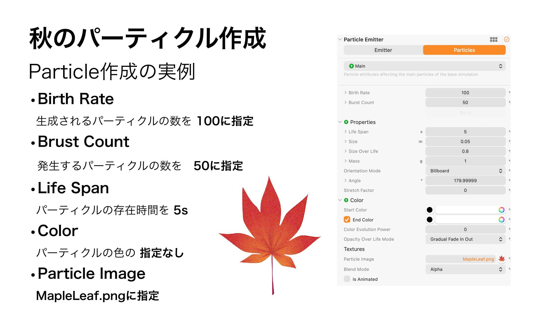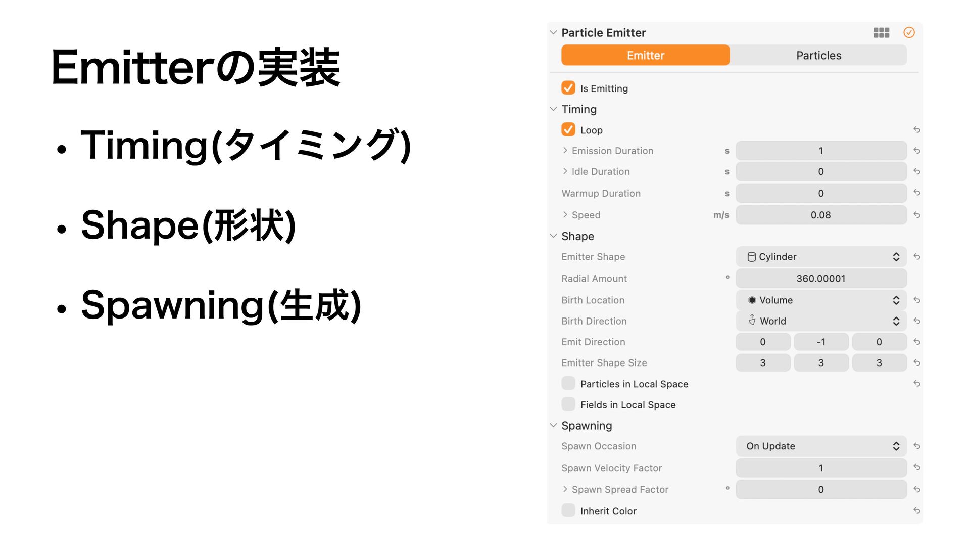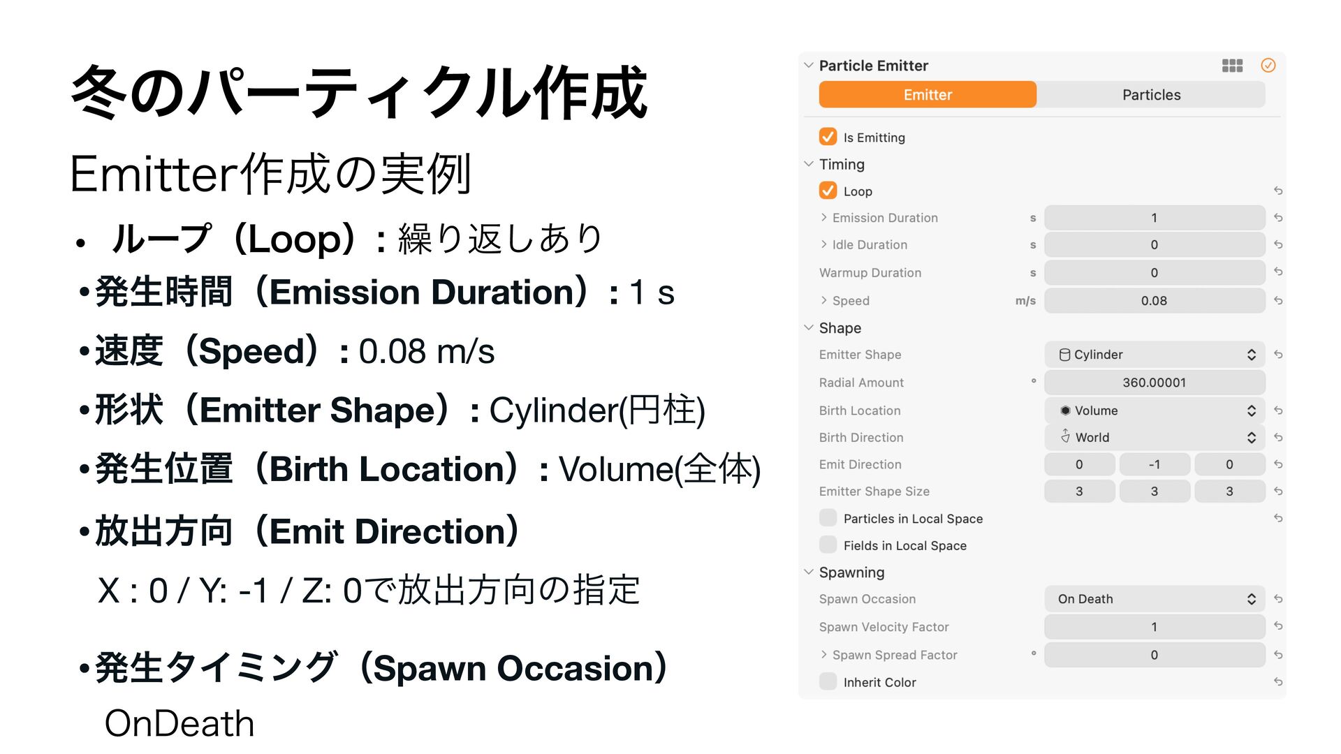 य़ͷύʔςΟΫϧ࡞ &NJUUFS࡞ͷ࣮ྫ w ϧʔϓʢ-PPQʣ܁Γฦ͋͠Γ •ൃੜ࣌ؒʢEmission Durationʣ: 1 s •ʢSpeedʣ: 0.08