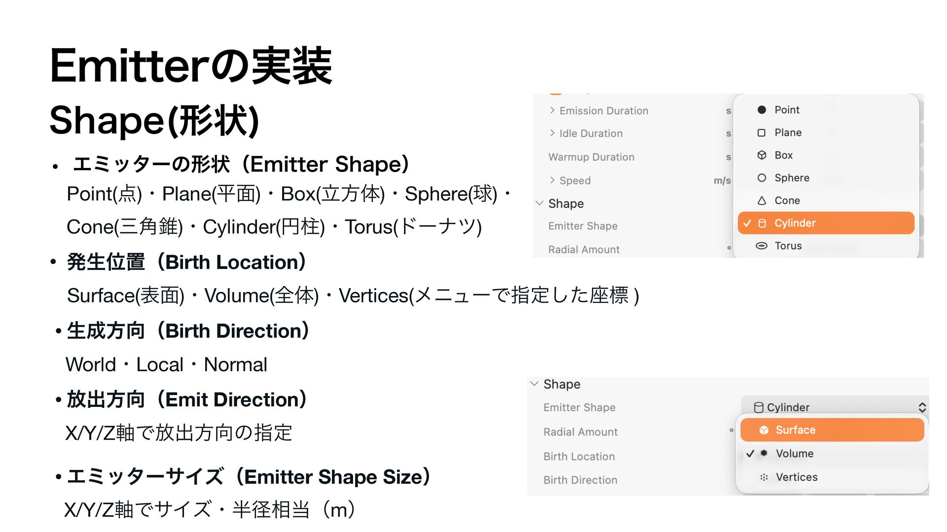 Surface(ද໘)ɾVolume(શମ)ɾVertices(ϝχϡʔͰࢦఆͨ͠࠲ඪ ) • ੜํʢBirth Directionʣ WorldɾLocalɾNormal • ์ग़ํʢEmit Directionʣ X/Y/Z࣠Ͱ์ग़ํͷࢦఆ • ΤϛολʔαΠζʢEmitter Shape Sizeʣ X/Y/Z࣠ͰαΠζɾܘ૬ʢmʣ 4IBQF ܗঢ়