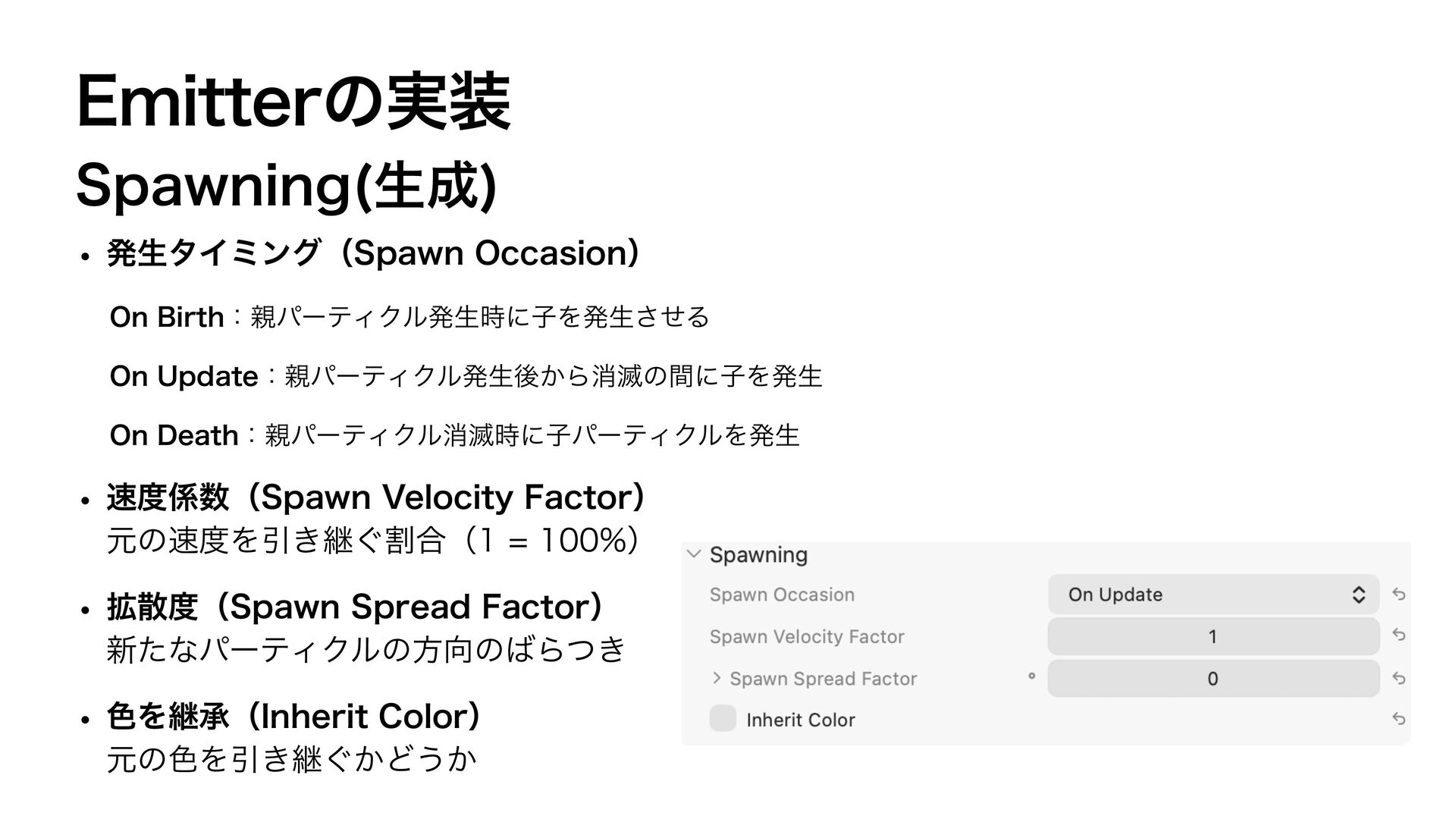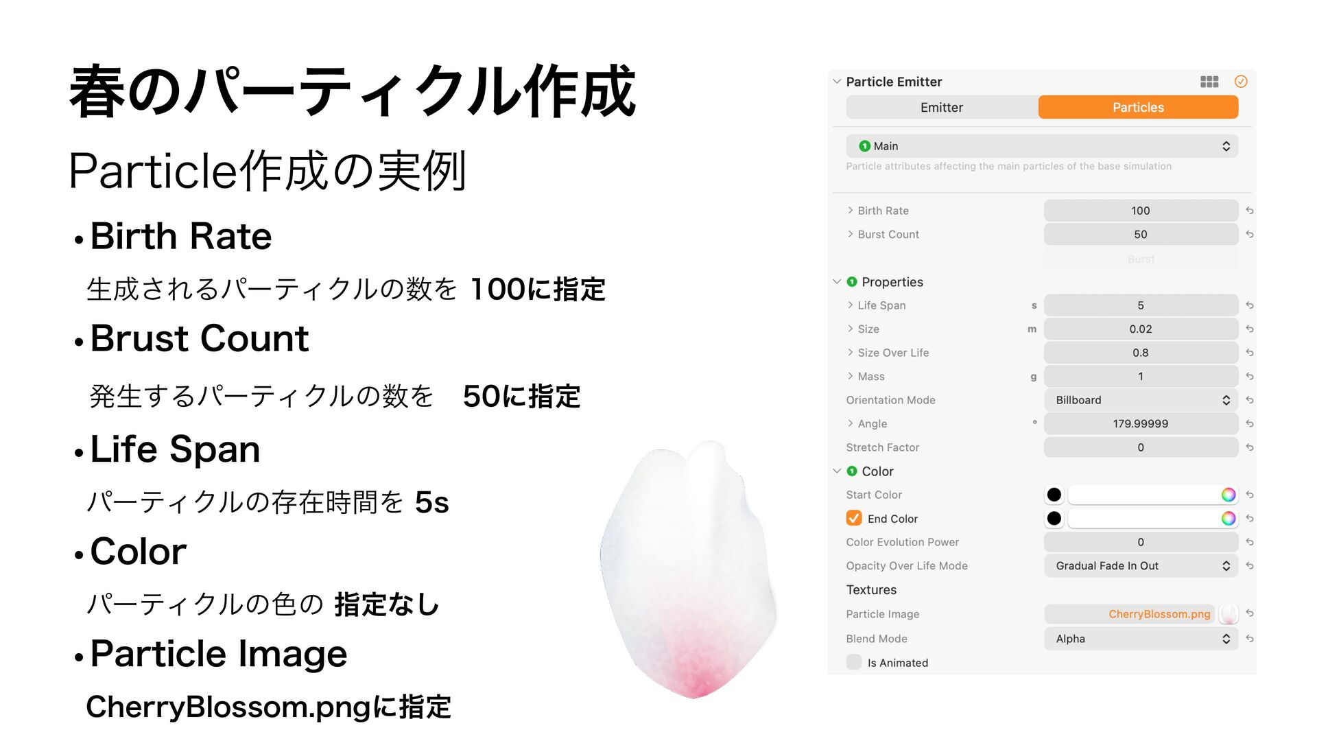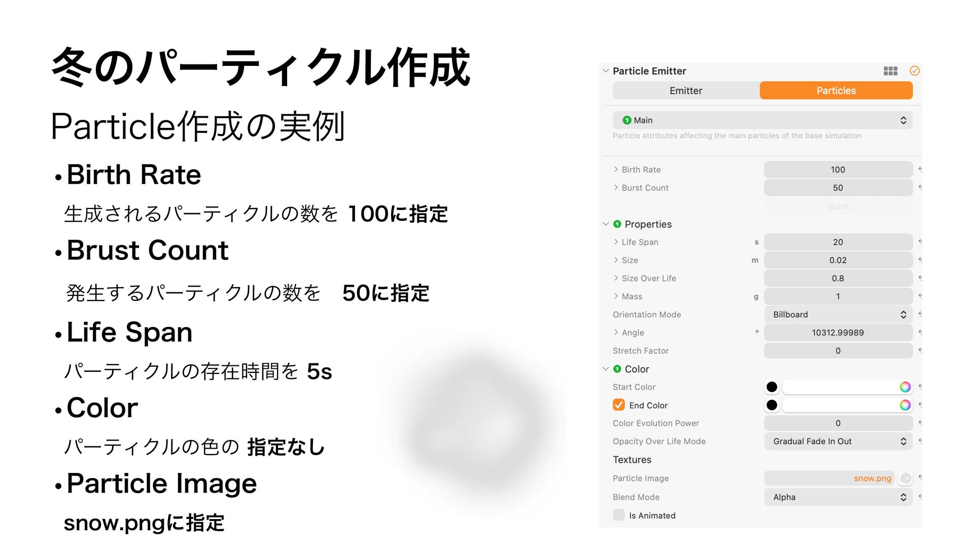 ळͷύʔςΟΫϧ࡞ 1BSUJDMF࡞ͷ࣮ྫ w#JSUI3BUF ੜ͞ΕΔύʔςΟΫϧͷΛʹࢦఆ w#SVTU$PVOU ൃੜ͢ΔύʔςΟΫϧͷΛɹʹࢦఆ w-JGF4QBO ύʔςΟΫϧͷଘࡏ࣌ؒΛT w$PMPS ύʔςΟΫϧͷ৭ͷࢦఆͳ͠