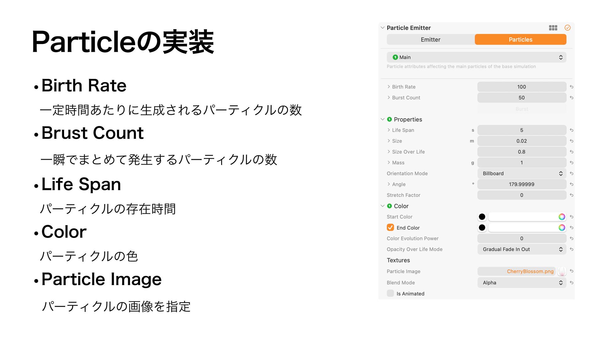 1BSUJDMFͷ࣮ w#JSUI3BUF Ұఆ࣌ؒ͋ͨΓʹੜ͞ΕΔύʔςΟΫϧͷ w#SVTU$PVOU ҰॠͰ·ͱΊͯൃੜ͢ΔύʔςΟΫϧͷ w-JGF4QBO ύʔςΟΫϧͷଘࡏ࣌ؒ w$PMPS ύʔςΟΫϧͷ৭ w1BSUJDMF*NBHF