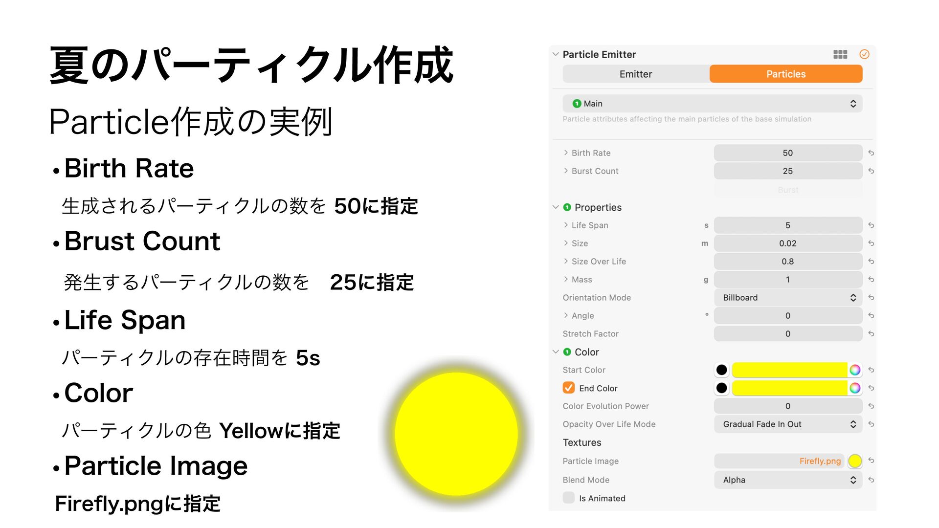ՆͷύʔςΟΫϧ࡞ 1BSUJDMF࡞ͷ࣮ྫ w#JSUI3BUF ੜ͞ΕΔύʔςΟΫϧͷΛʹࢦఆ w#SVTU$PVOU ൃੜ͢ΔύʔςΟΫϧͷΛɹʹࢦఆ w-JGF4QBO ύʔςΟΫϧͷଘࡏ࣌ؒΛT w$PMPS ύʔςΟΫϧͷ৭:FMMPXʹࢦఆ