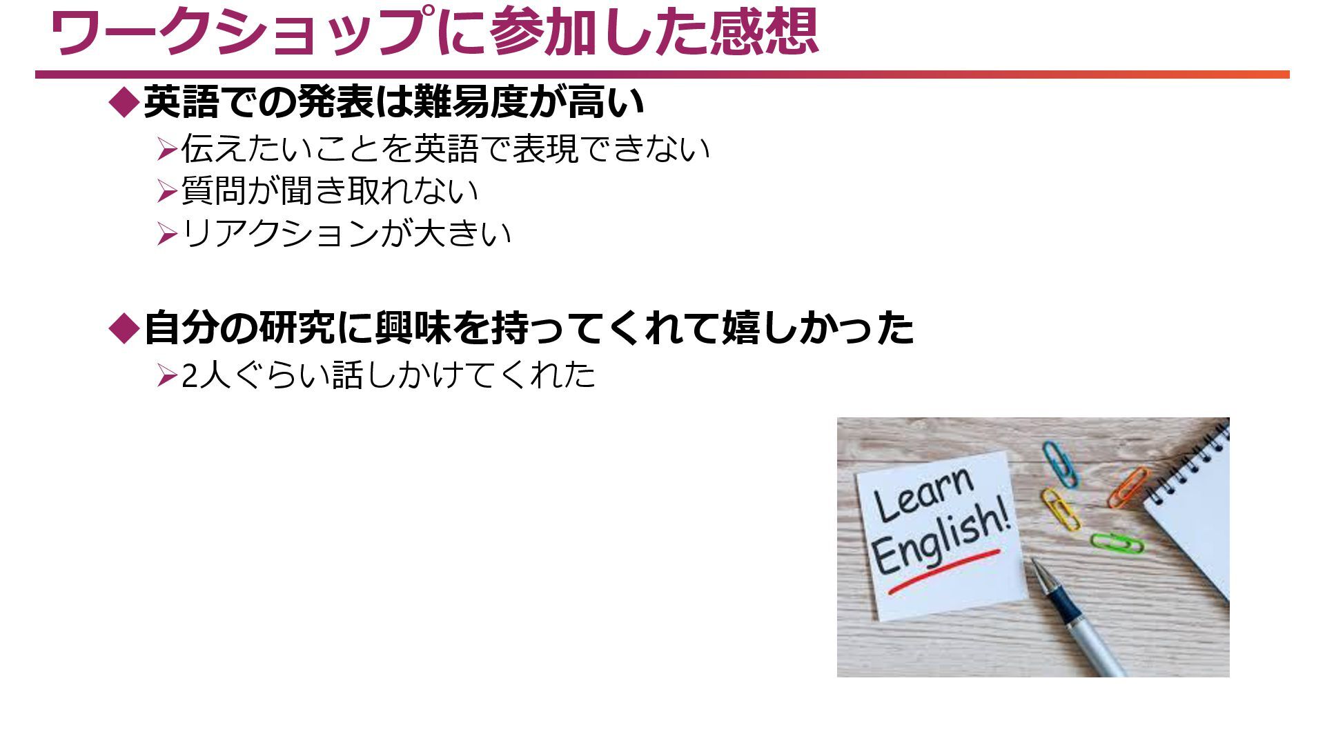 ワークショップに参加した感想 ◆英語での発表は難易度が高い ➢伝えたいことを英語で表現できない ➢質問が聞き取れない ➢リアクションが大きい ◆自分の研究に興味を持ってくれて嬉しかった ➢2人ぐらい話しかけてくれた