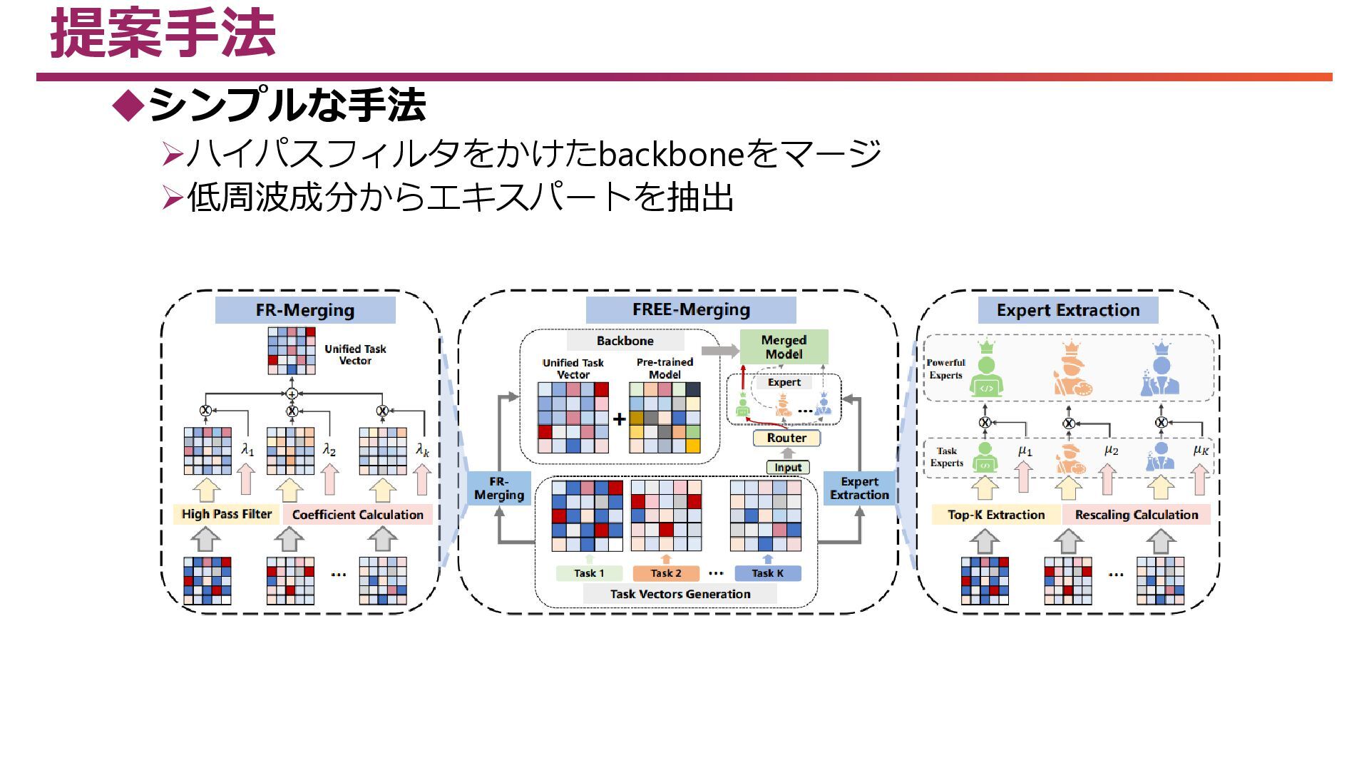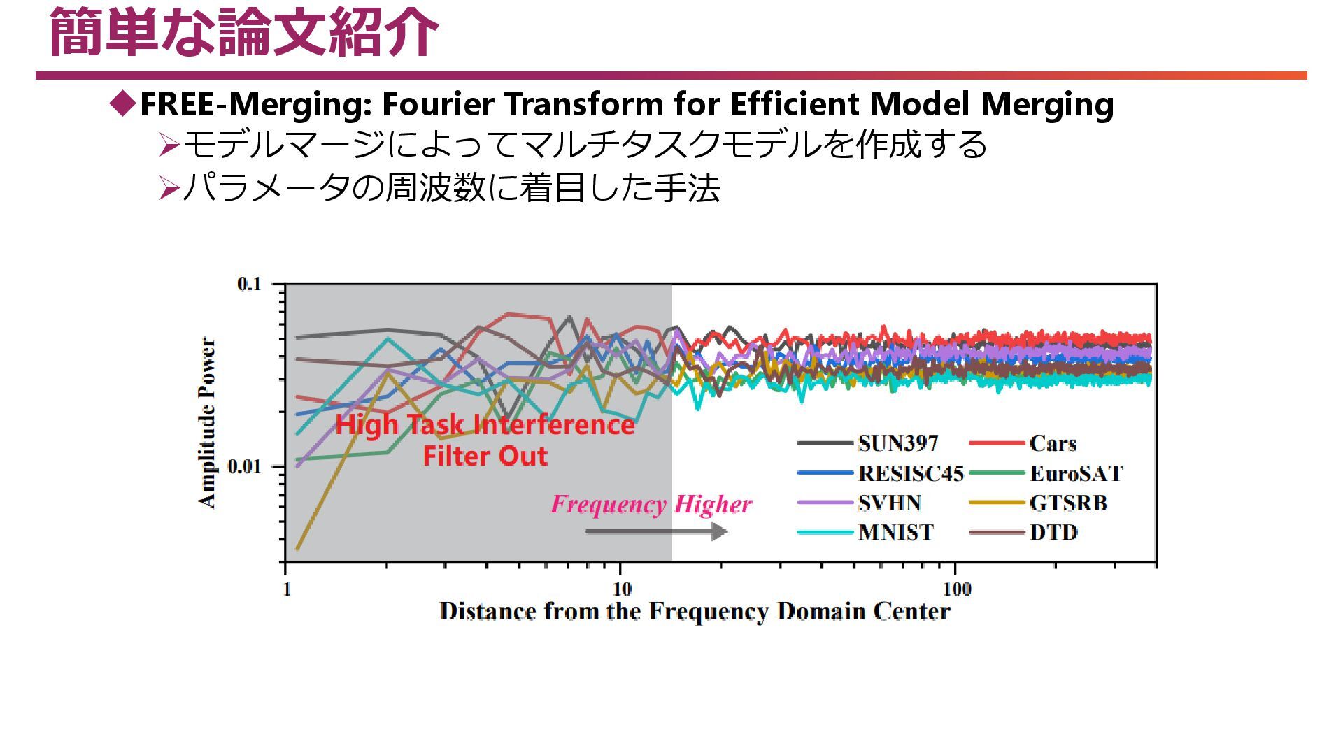 簡単な論文紹介 ◆FREE-Merging: Fourier Transform for Efficient Model Merging ➢モデルマージによってマルチタスクモデルを作成する ➢パラメータの周波数に着目した手法